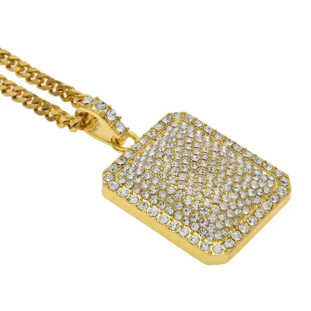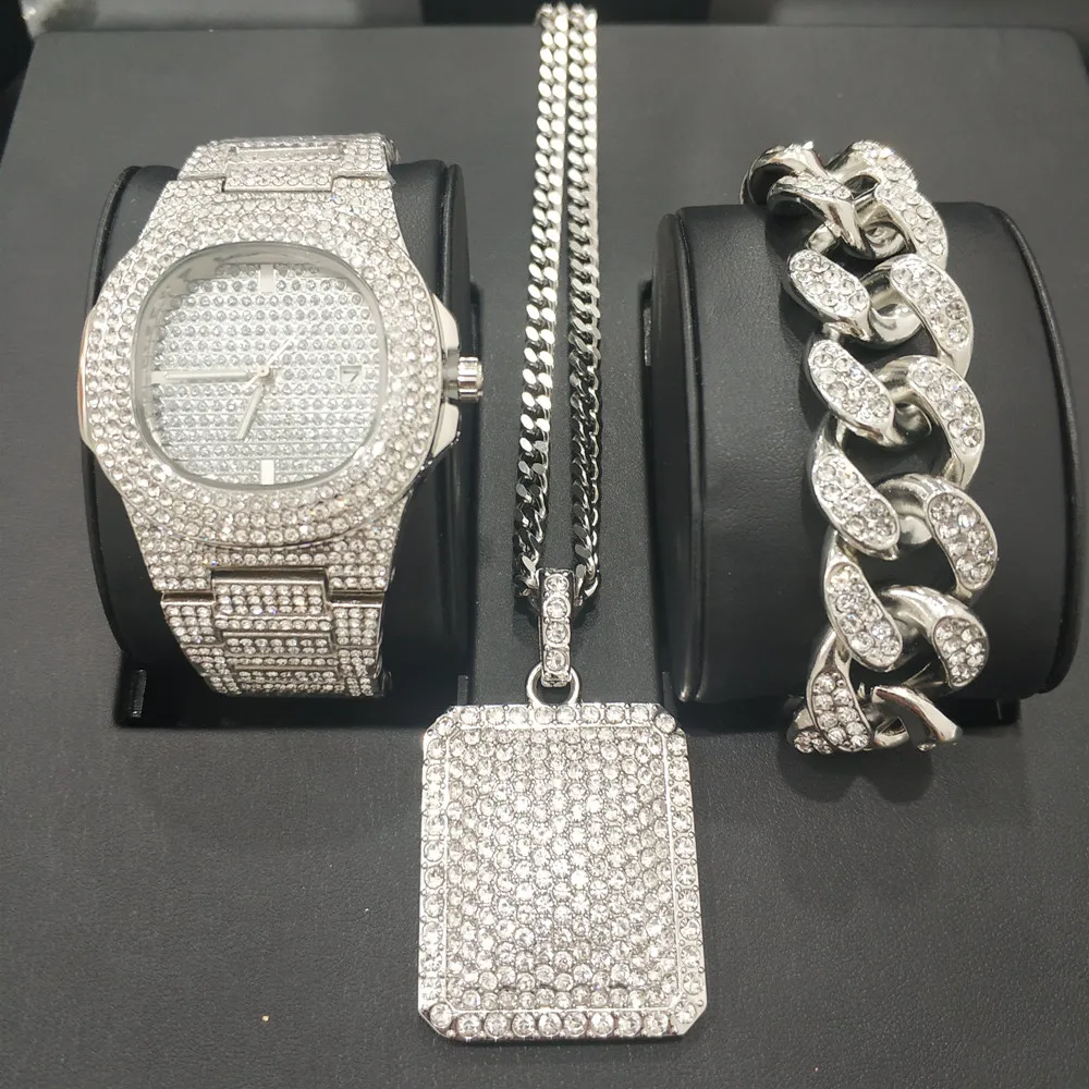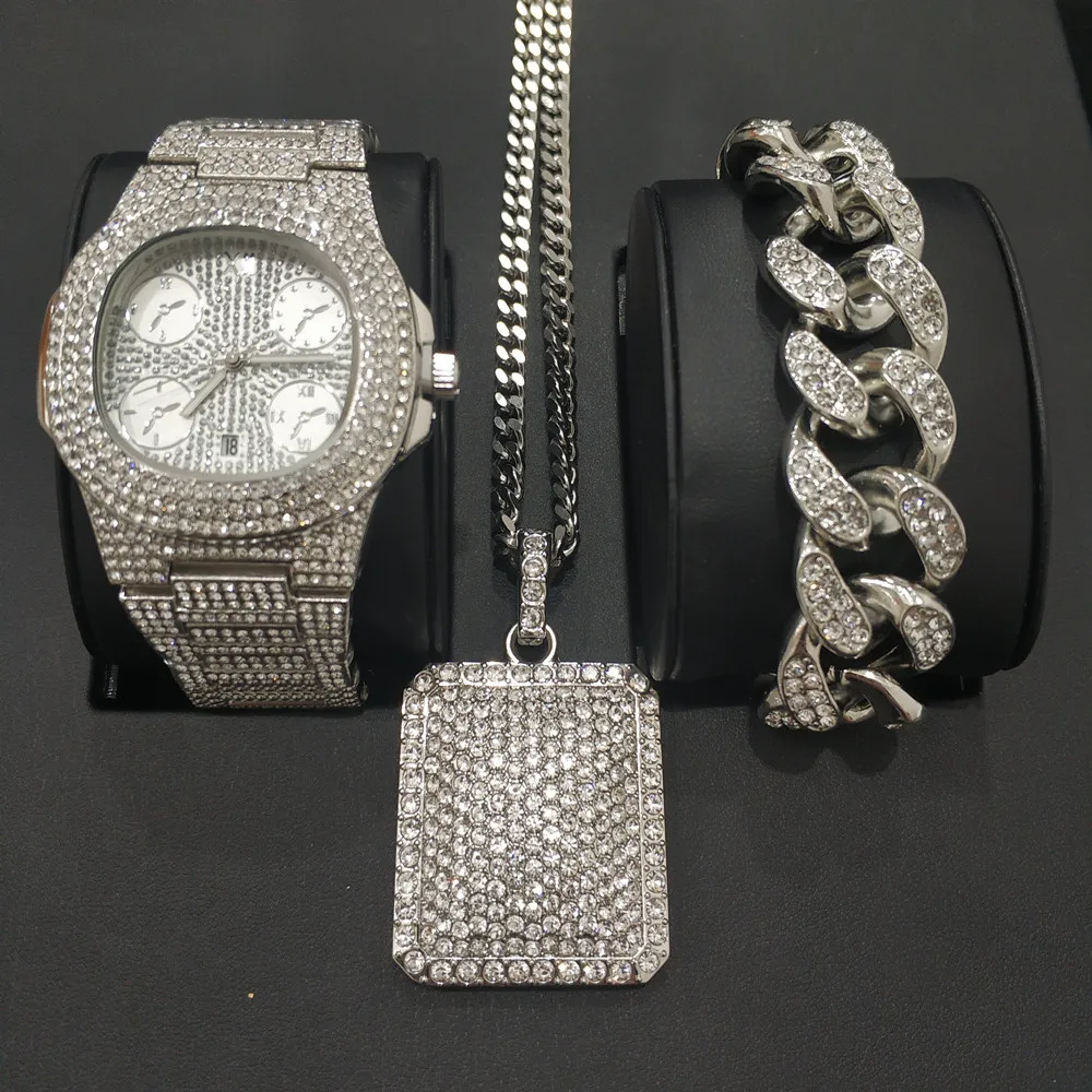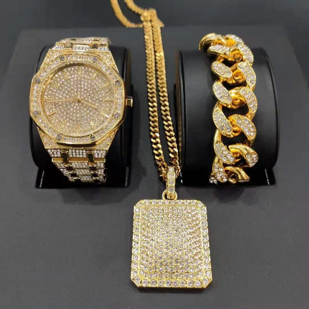 Роскошные мужские часы золотого цвета, браслет и ожерелье, комплект часы, кубинский кристалл, кулон, хип-хоп ювелирные изделия для мужчин