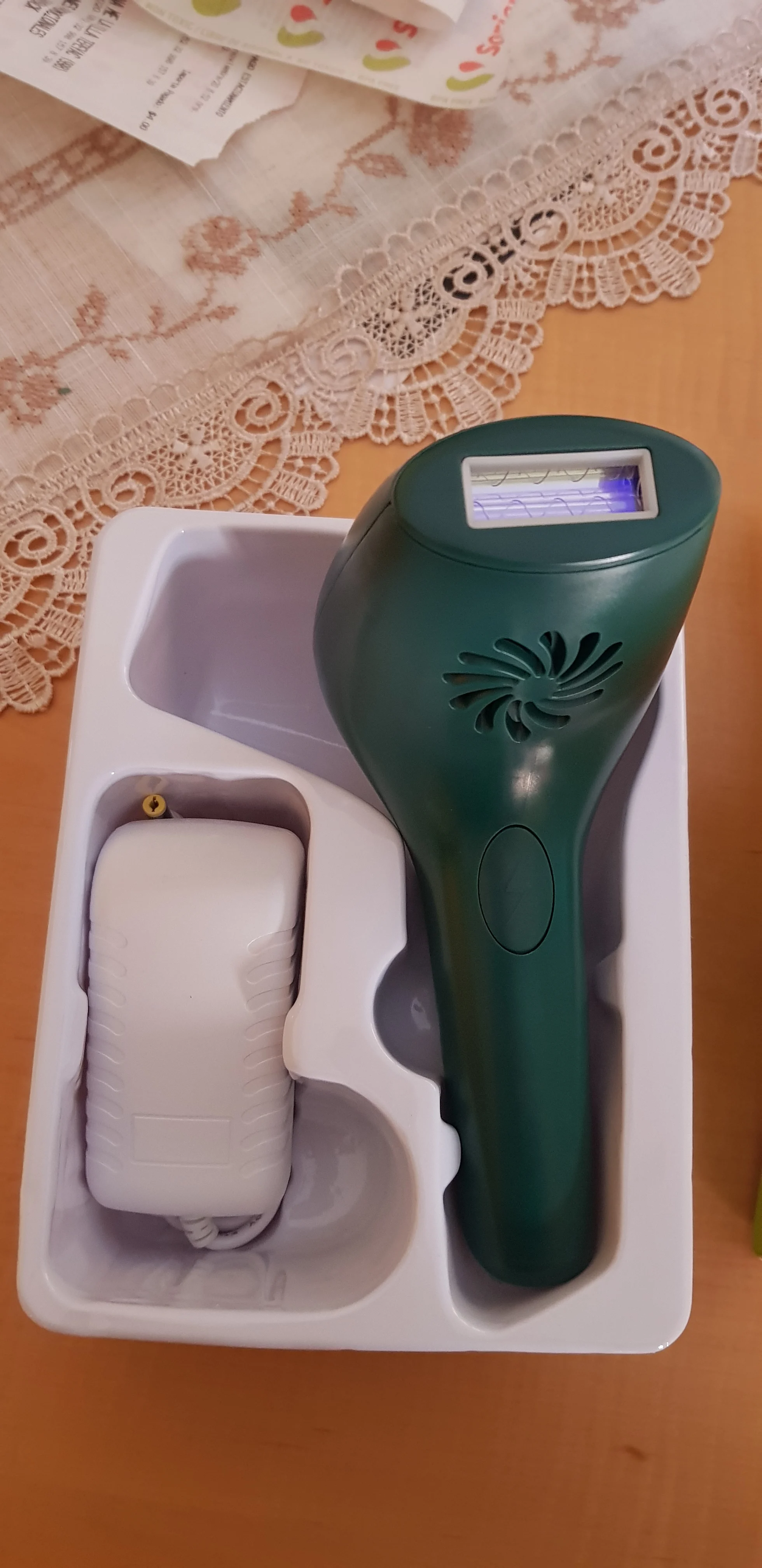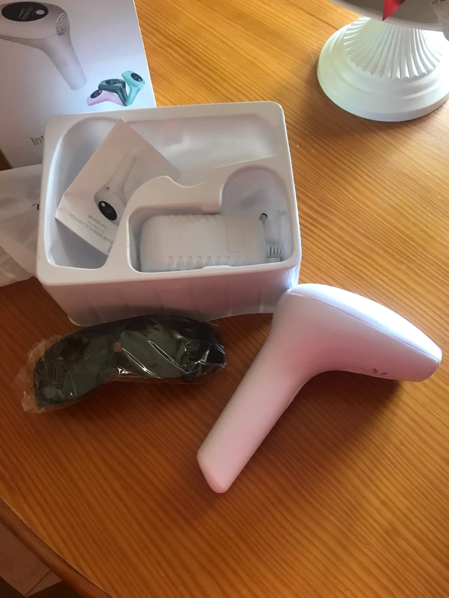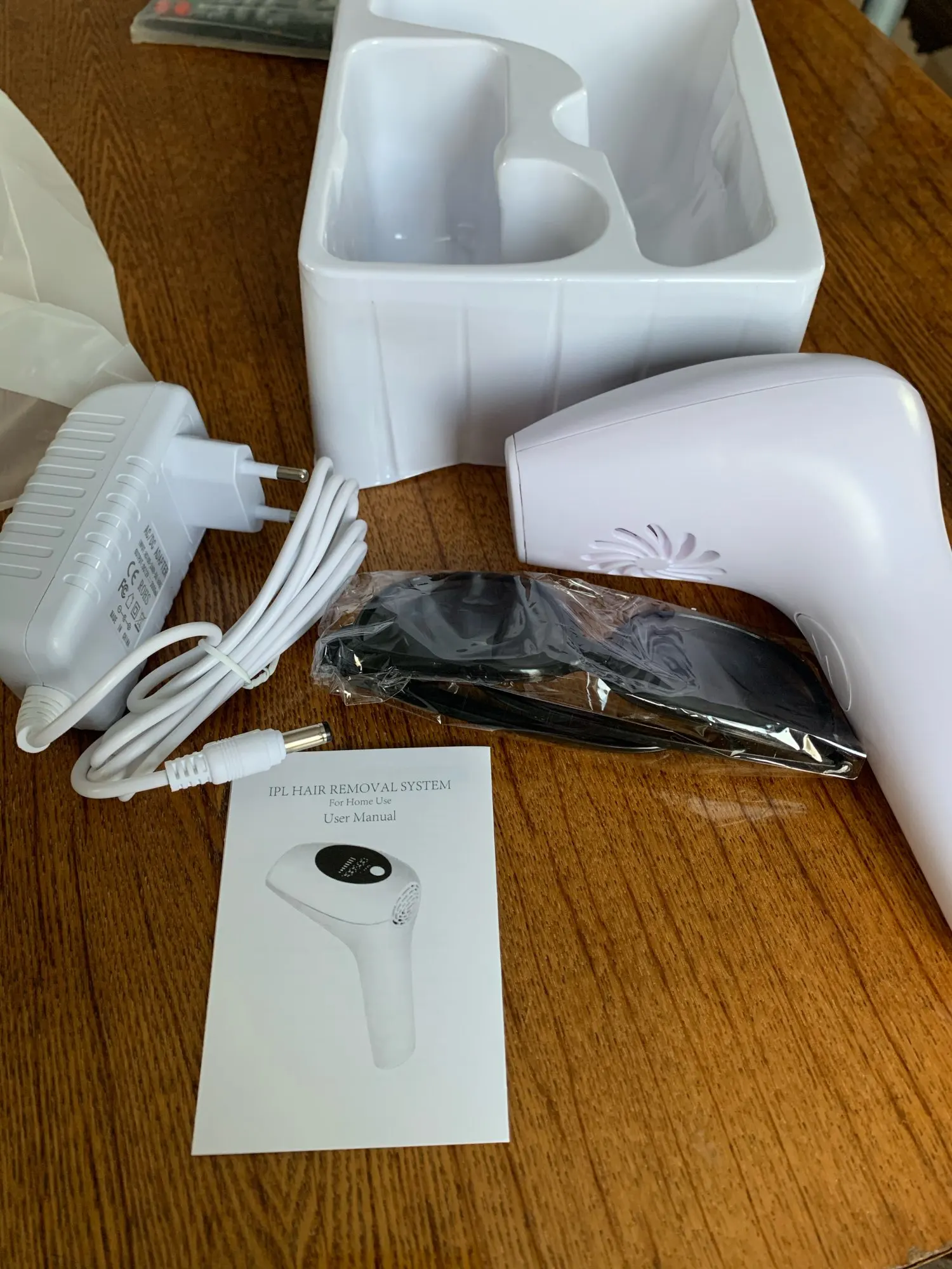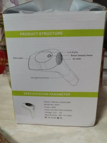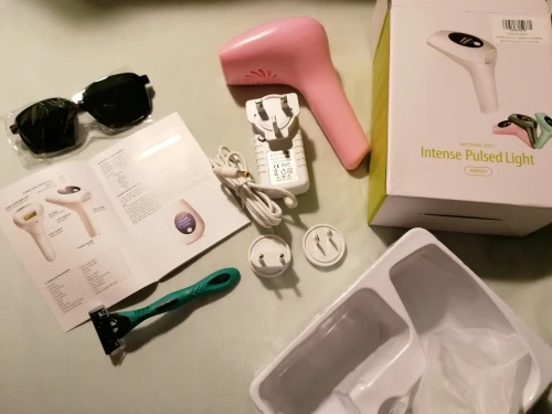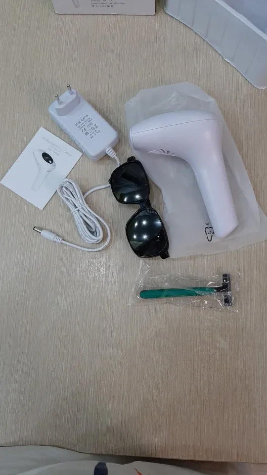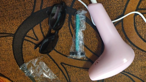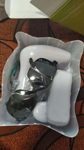 Посылку отправили на 2-3 день, но доставили в течение двух недель. Вспышек больше, чем заявлено и это плюс продавцу. В комплекте очки, станок одноразовый, инструкция на английском, сам аппарат. Работает от разетки, можно прибавлять и убавлять мощность. Включали все работает. О результате добавлю позже после тестирования. Продавцу спасибо и процветания. Всем рекомендую.