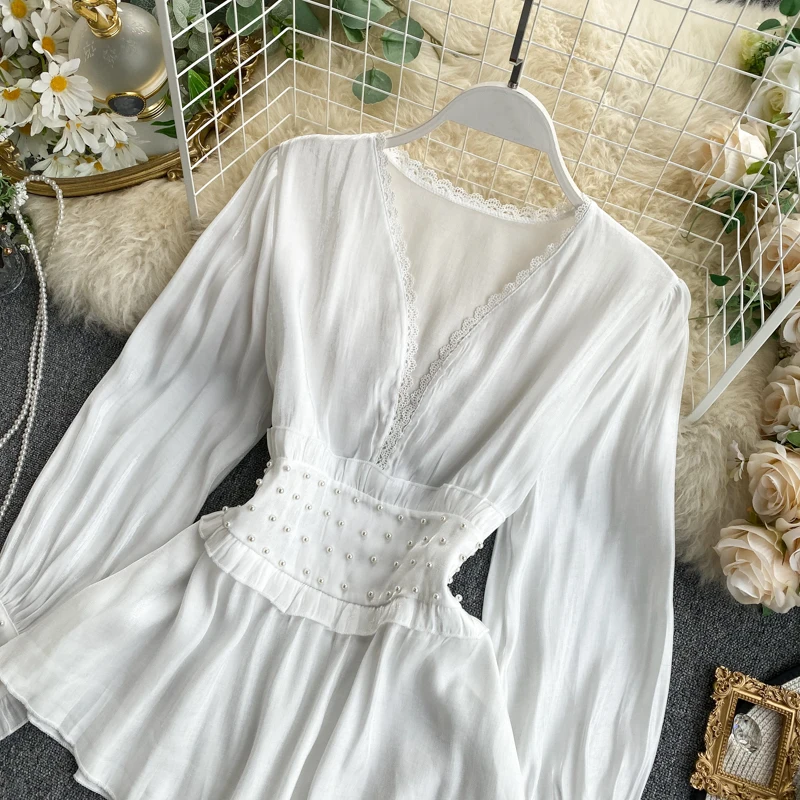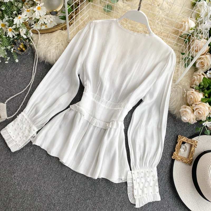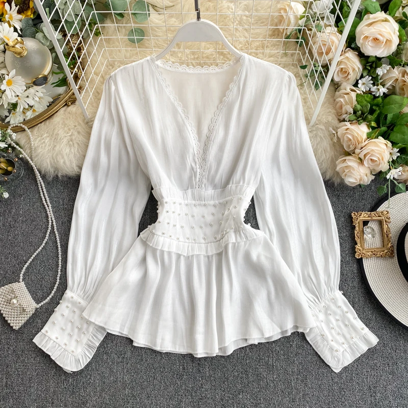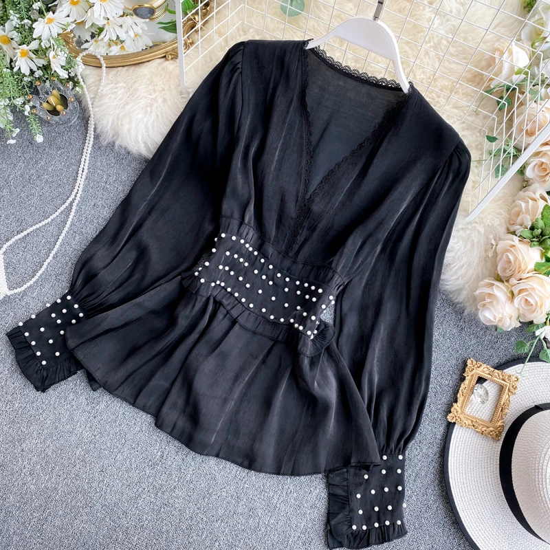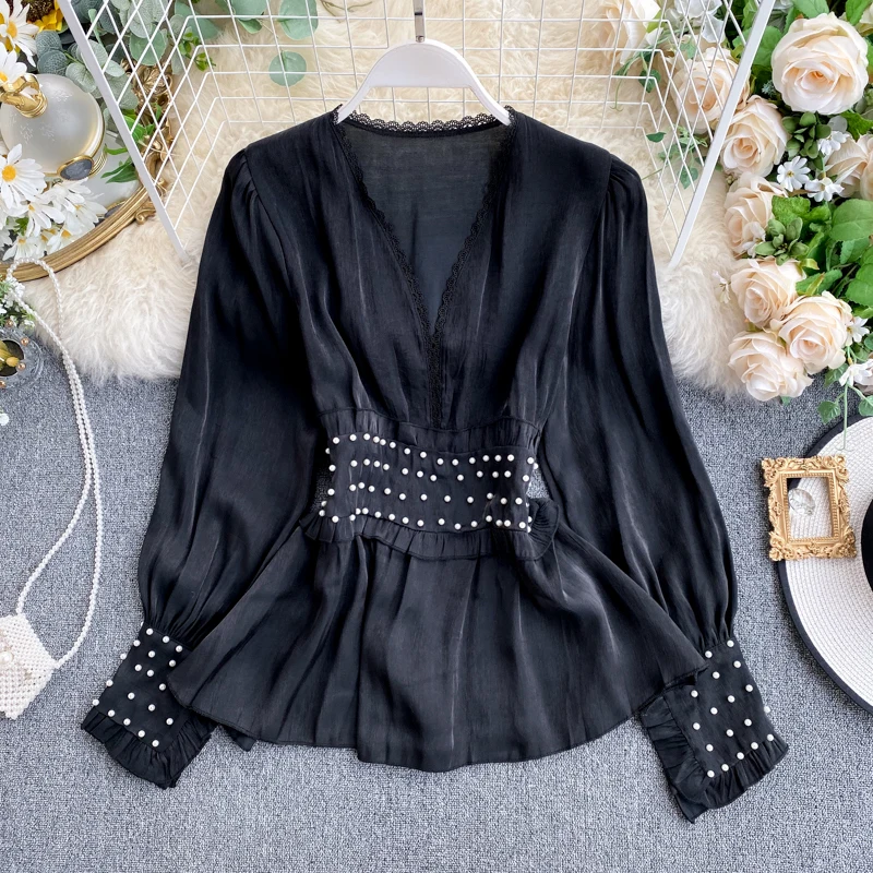 Женская блузка с v-образным вырезом, элегантная однотонная блузка для работы с жемчугом, весна 2020, L447