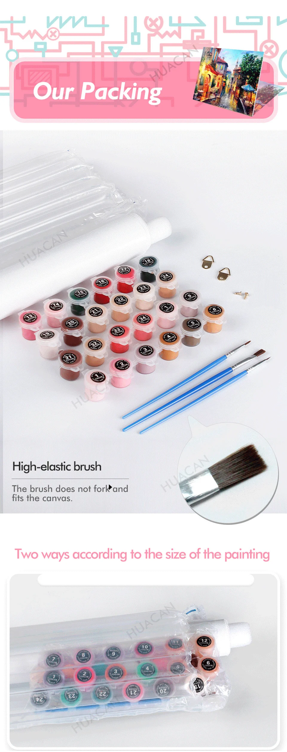 Инструменты:1 x холст/3 x кисти (1big,1 средний, 1 небольшой)/1 Набор лаков/2 не оставляющих следов крючка/Винты-2 шт.