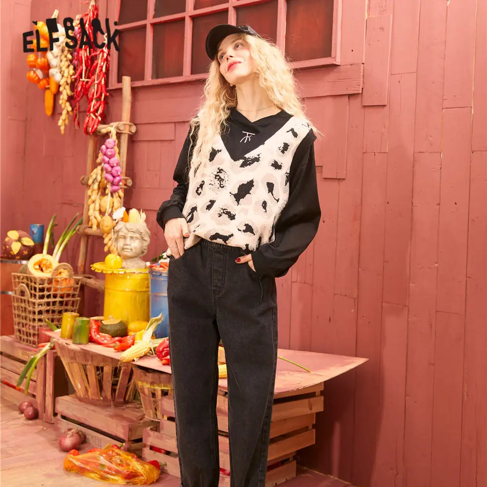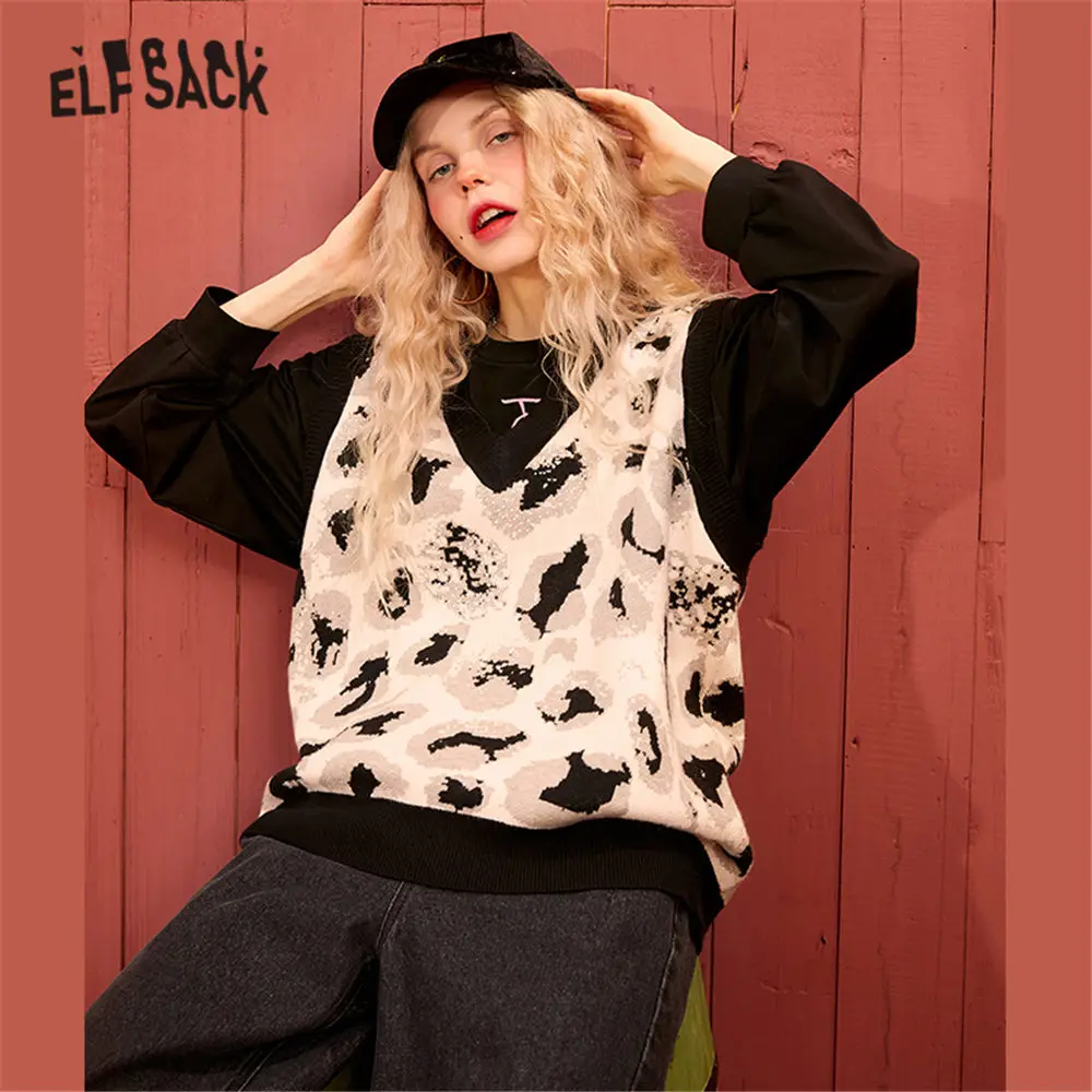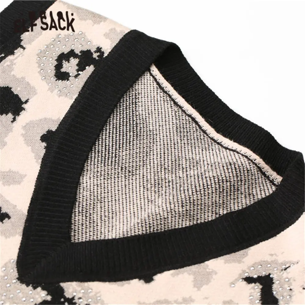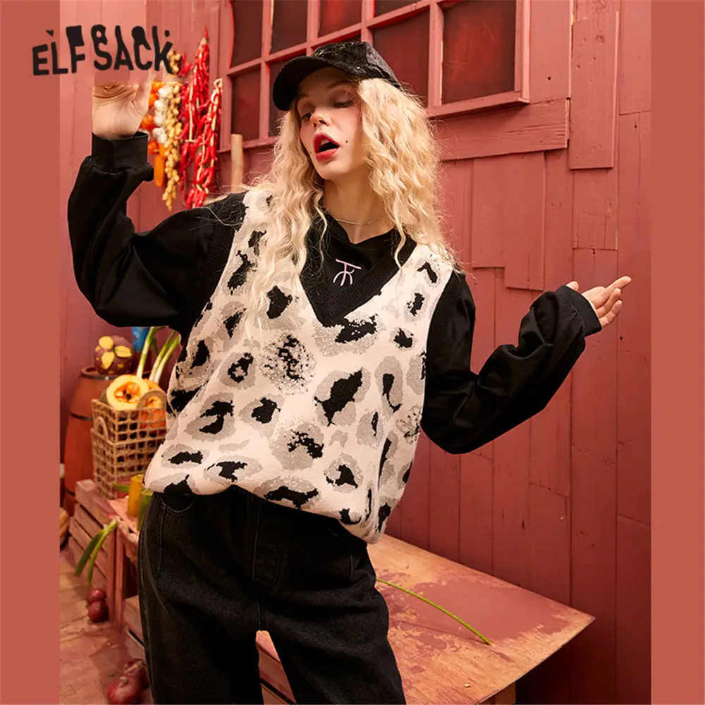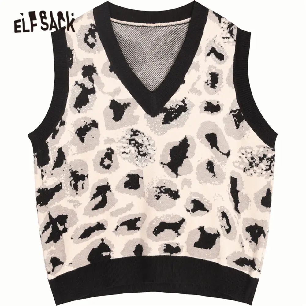 Женский трикотажный пуловер ELFSACK, белый пуловер с леопардовым принтом и стразами, свитер без рукавов с v-образным вырезом, повседневные женские топы на каждый день, весна 2020