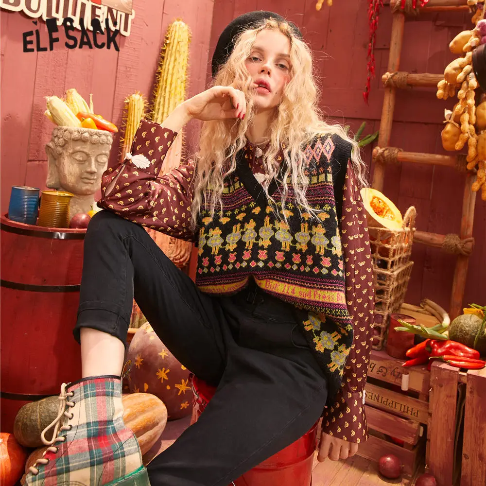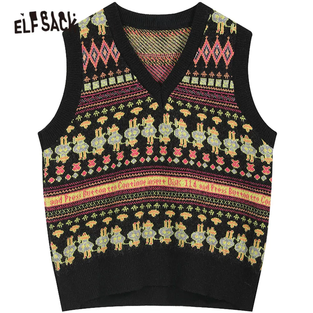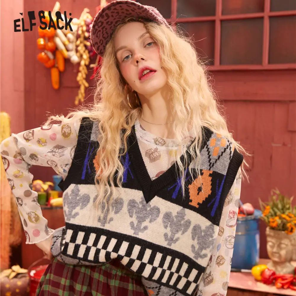 Женский винтажный трикотажный пуловер ELFSACK, зеленый Повседневный пуловер с v-образным вырезом без рукавов, с графическим принтом, весна 2020