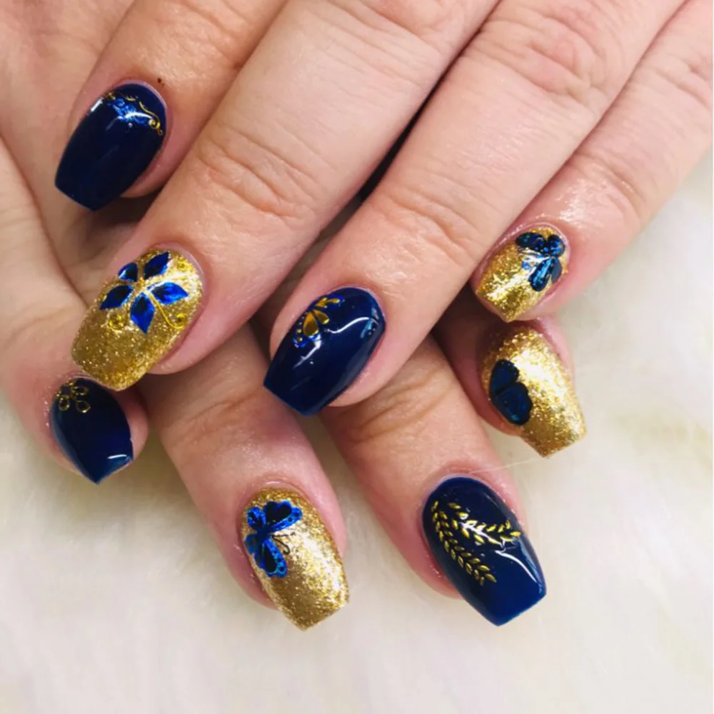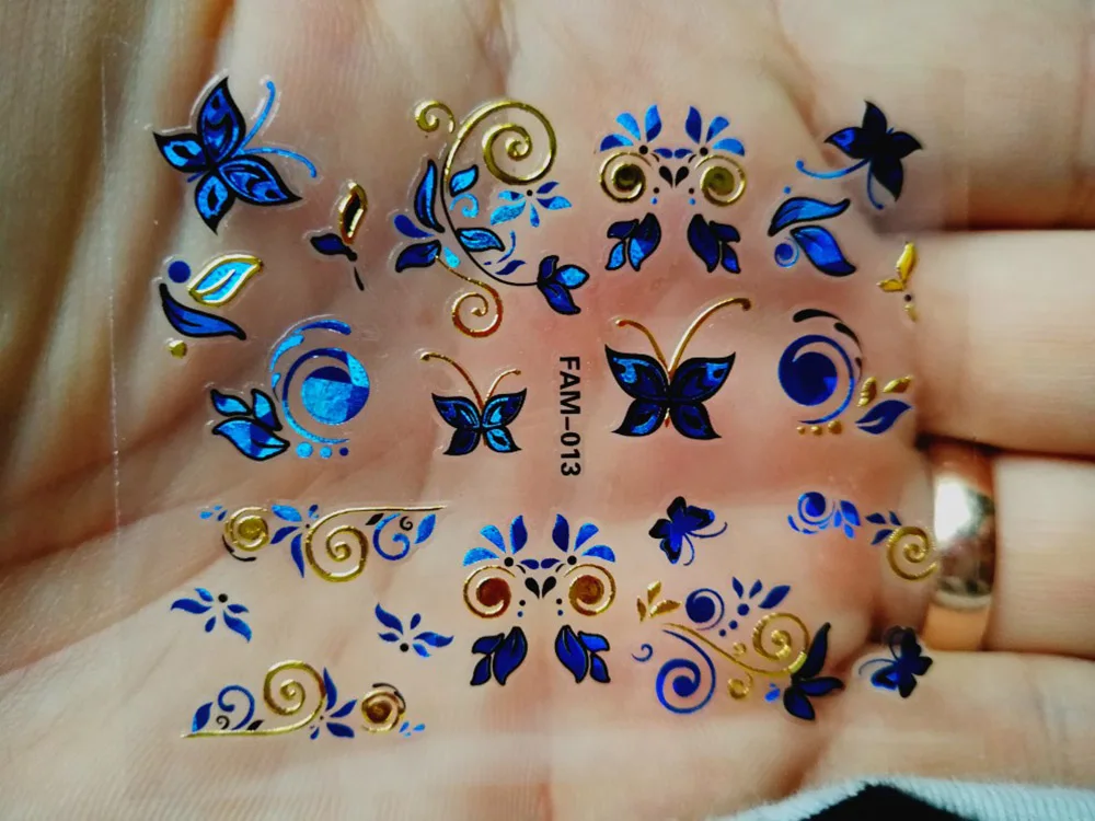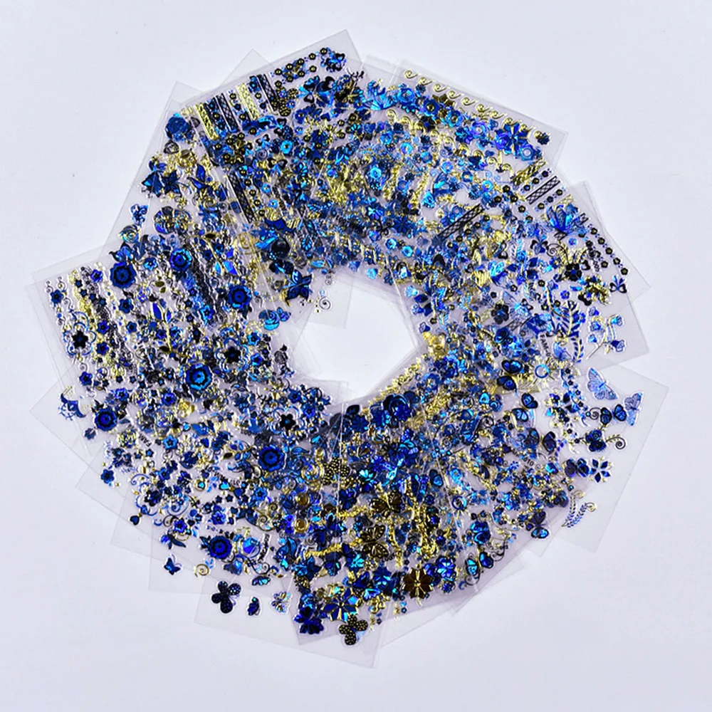 30 листовнабор, стикеры 3D на ногти Nail Art, золотые, синие, блестящие наклейки, горячее тиснение, блестящие цветы бабочки, Самоклеющиеся татуировки для ногтей HJ021