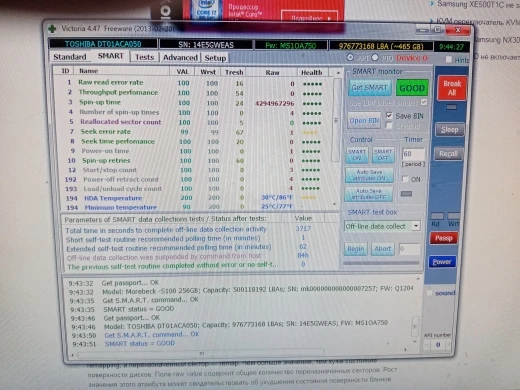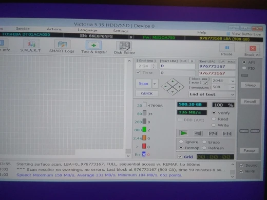 Жесткий диск приехал за 3 недели. Реальный объем диска 478 ГБ. Ошибок и битых секторов на диске нет. Приехал разбитым на два раздела 25ГБ и 453 ГБ. Работает довольно шустро.