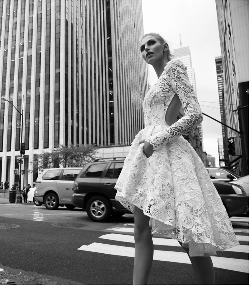 Платье свадебное короткое с длинным рукавом и кружевной аппликацией