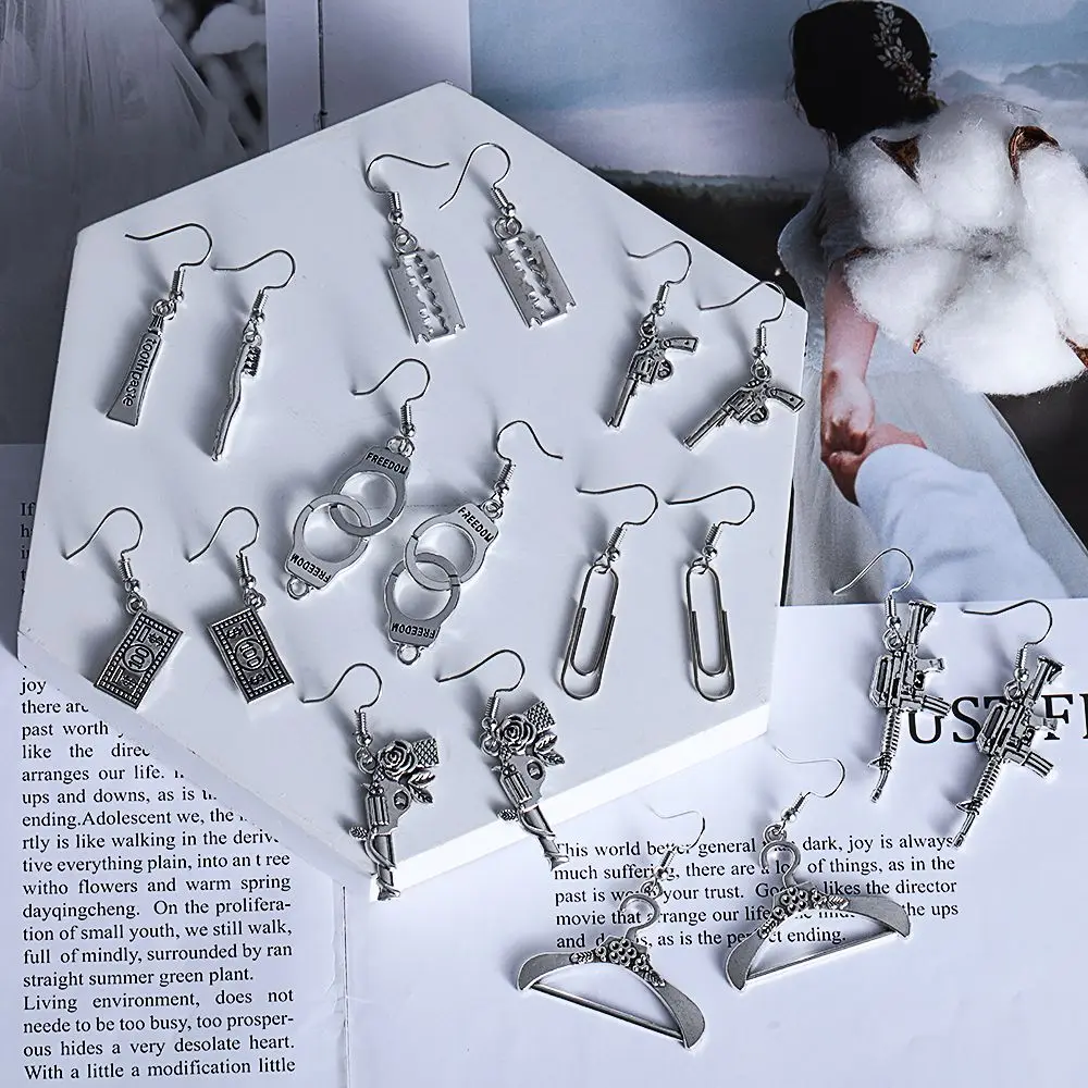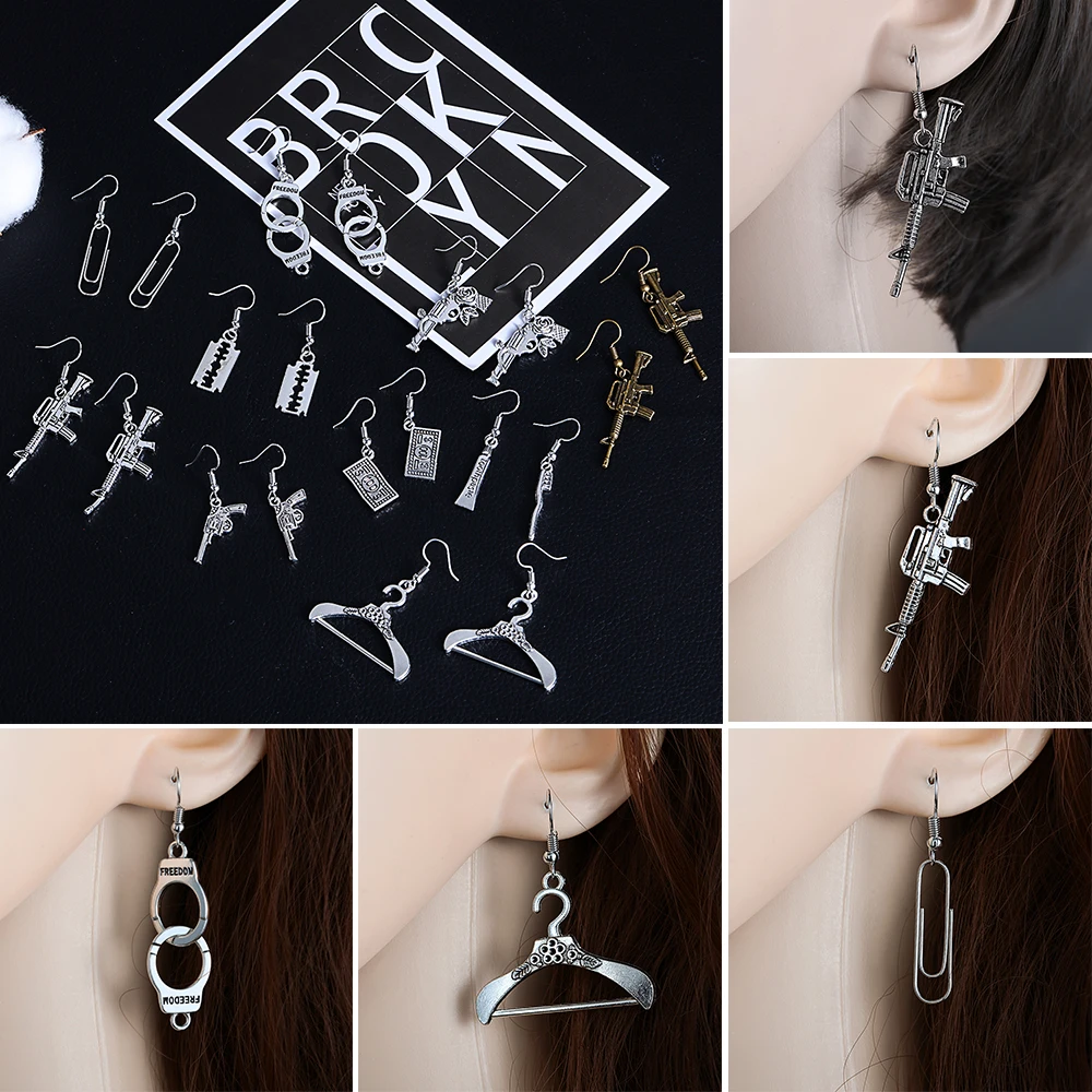 100% абсолютно новый, высокое качествоРазмер: как на картинкеЦвет: античное сереброФорма: пистолет/лезвие/наручники/зубная пастаМатериал: металлПосылка включает в себя: 1 пара сережек