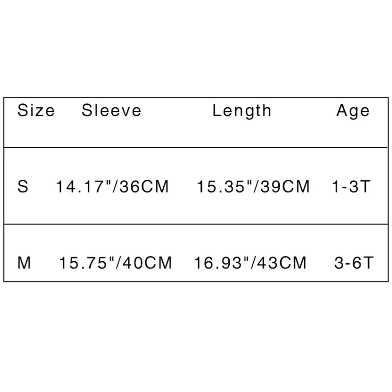 Таблица размеровРазмер ----- рукав ---------- длина ------ возрастS----14.17 "/36cm---15.35"/39cm--1-3tM---15.75 "/40cm---16.93"/43cm--3-6t