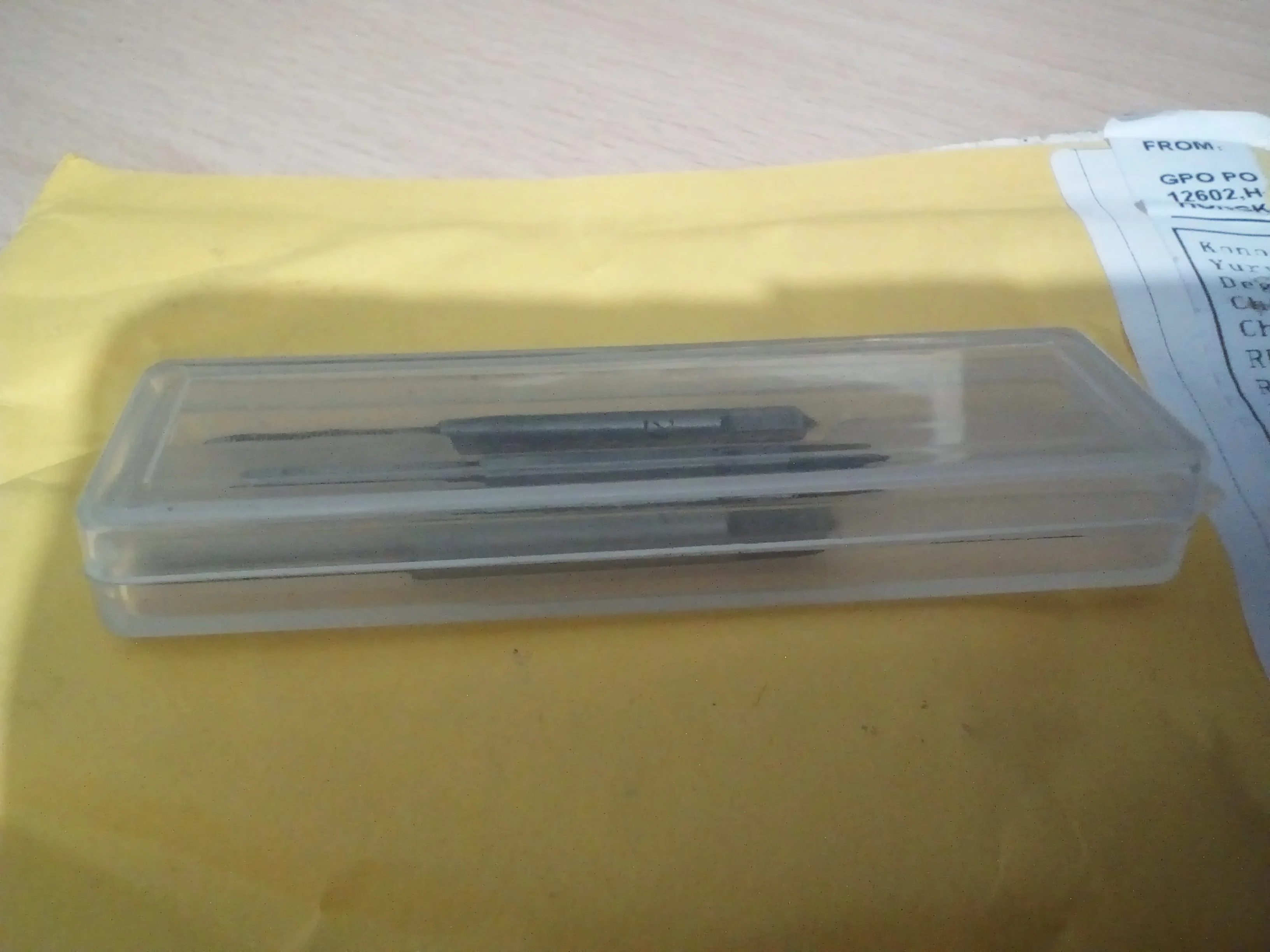 На Южный Урал посылка шла 19 дней. Отслеживалась.Продавец отправил быстро.Получал на почте. Три метчика М2*0,4 мм в пластиковой коробочке.Один метчик заточен под первый номер, два вторых. Маркировка четкая, качество заводское.Рекомендую. И продавец надежный!