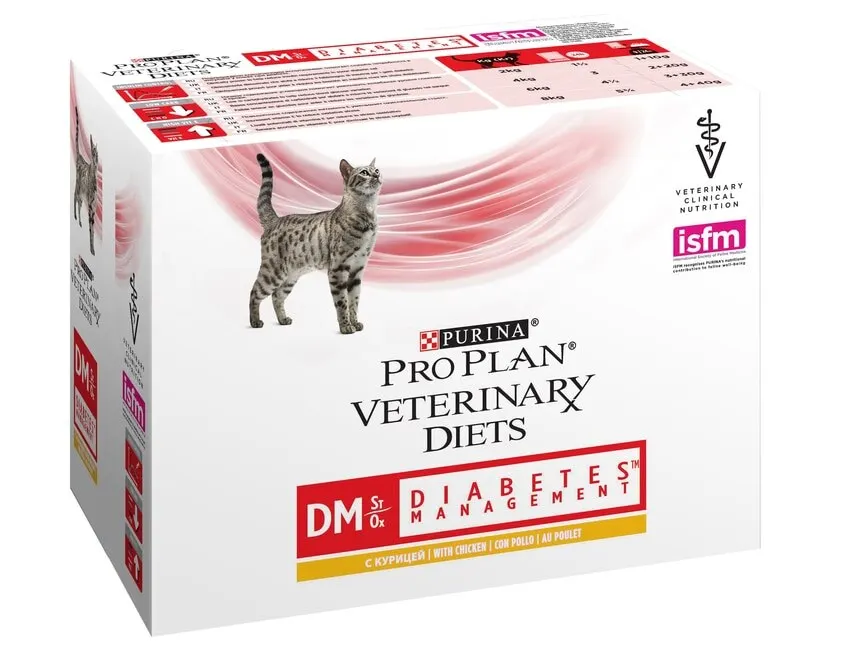 Pro Plan Veterinary Diets DM Diabetic Management - консервированный корм для кошек при сахарном диабете (со вкусом курицы).Преимущества корма:Контроль инсулина.Очень низкое содержание углеводов.Повышенный уровень витамина E уменьшает окислительный стресс, связанный с сахарным диабетом.Показания:Сахарный диабет.Хроническая диарея.Противопоказания: Почечная недостаточность.Патологические гепатические шунты.Рост и репродукция.