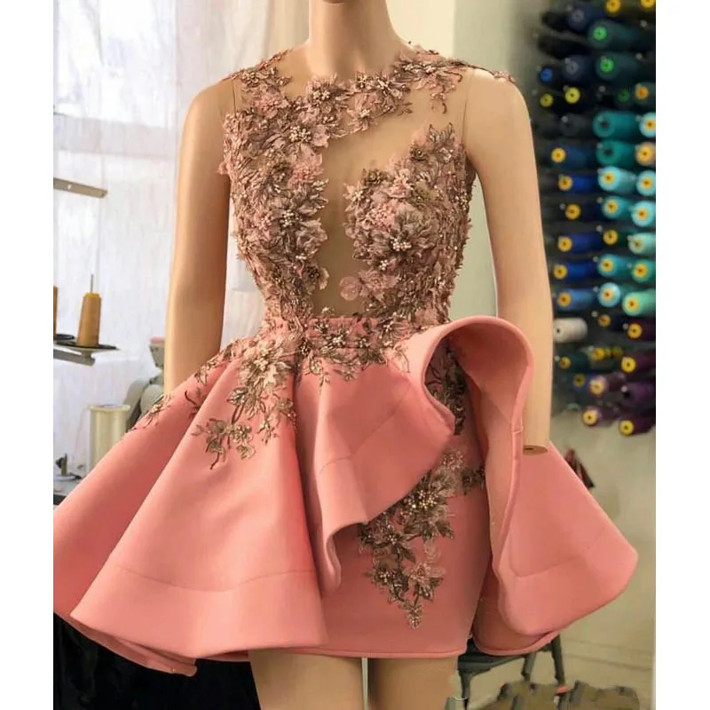 Платье для выпускного вечера Персиковое розовое, короткое Прозрачное платье выше колена с баской, 3D цветочной аппликацией и бисером, иллюзионное платье для выпускного вечера со съемной юбкой