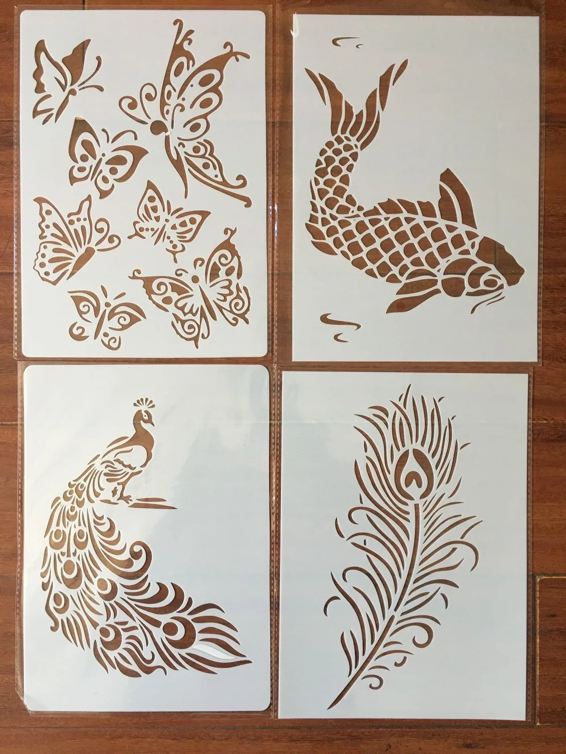 4 шт.компл. A4 перо павлина рыба бабочка трафареты окраска тиснение, Скрапбукинг альбом декоративный шаблон