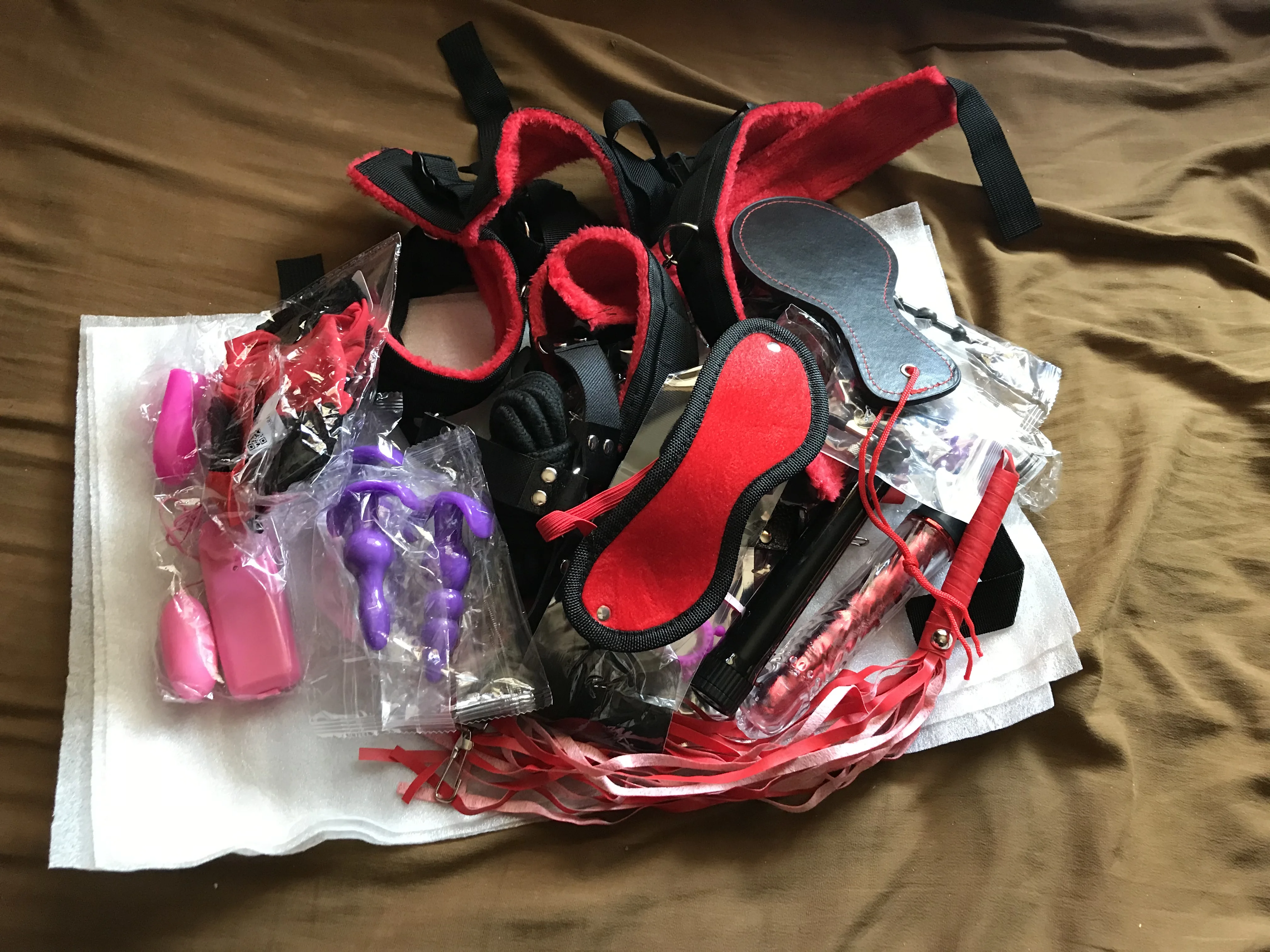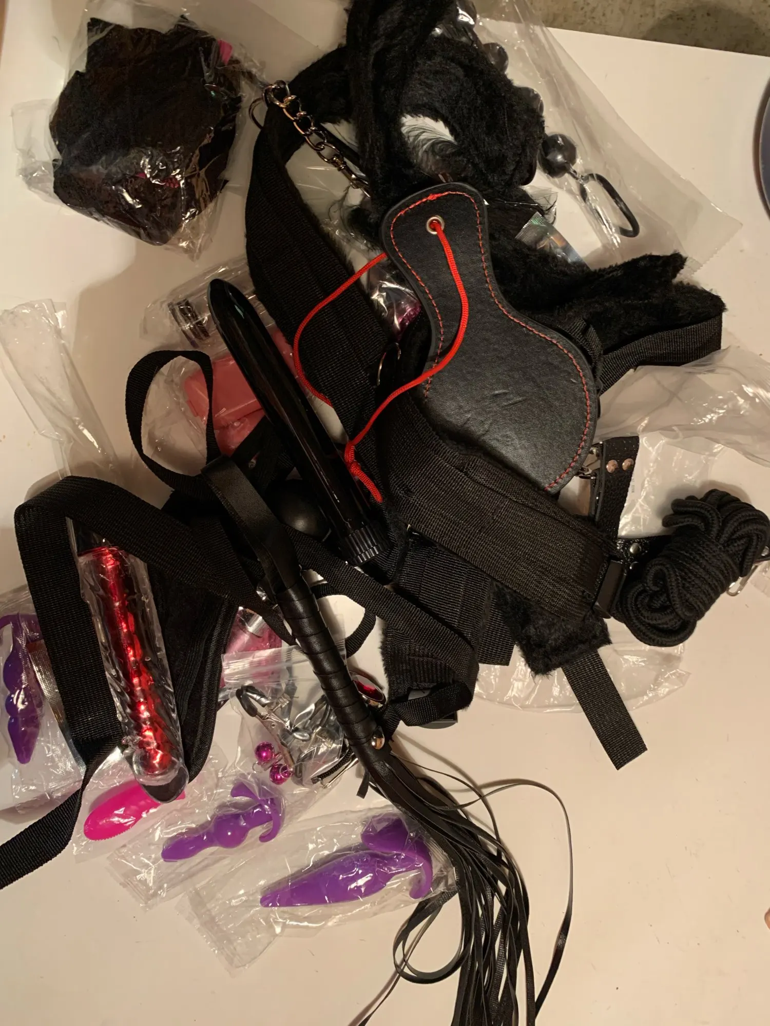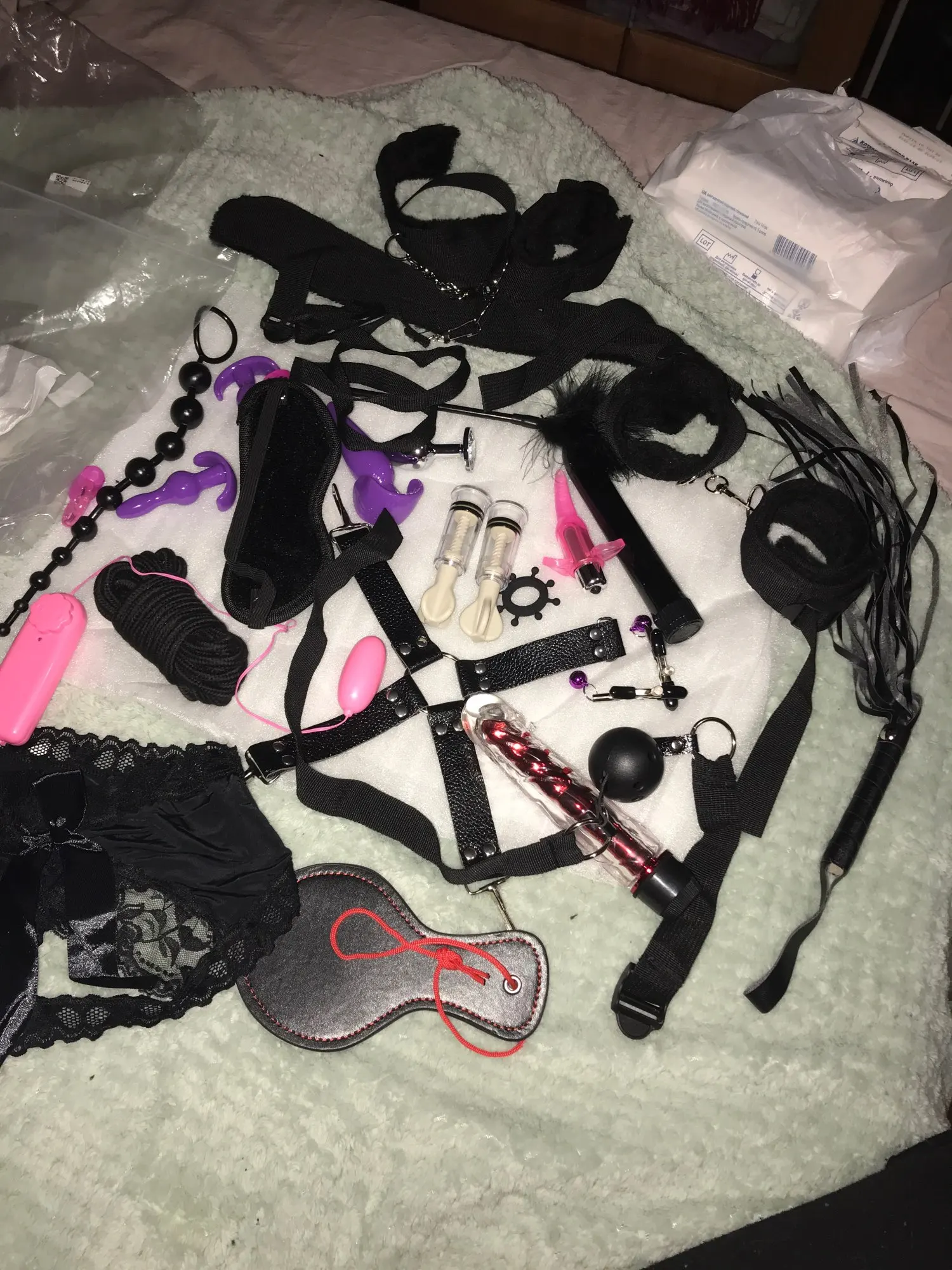 Пришло за 2 недели. Смущают небольшие размерчики плеточки, пробочек, фаллосов... Остальное будем пробовать...