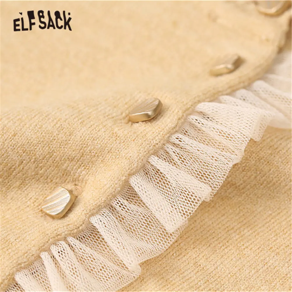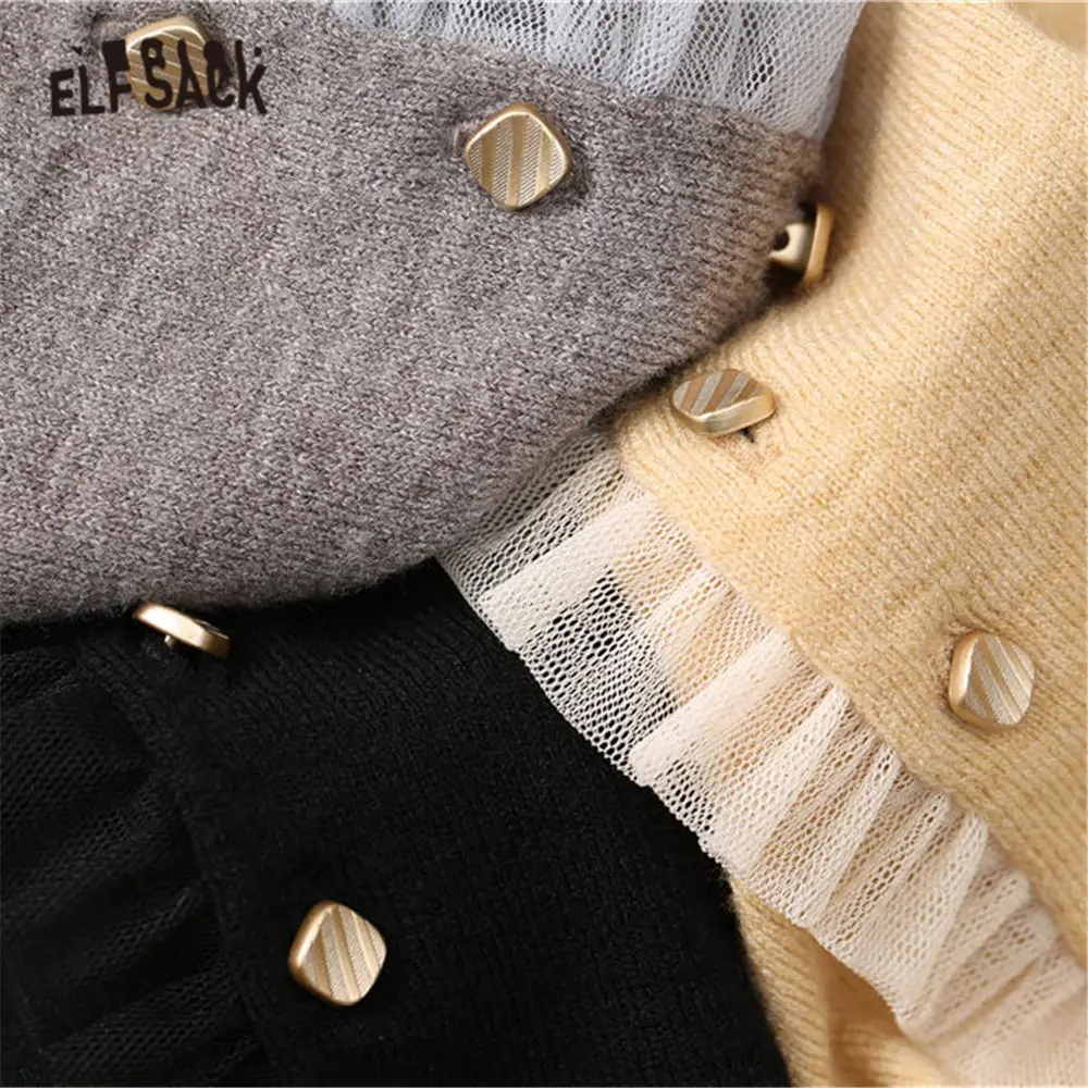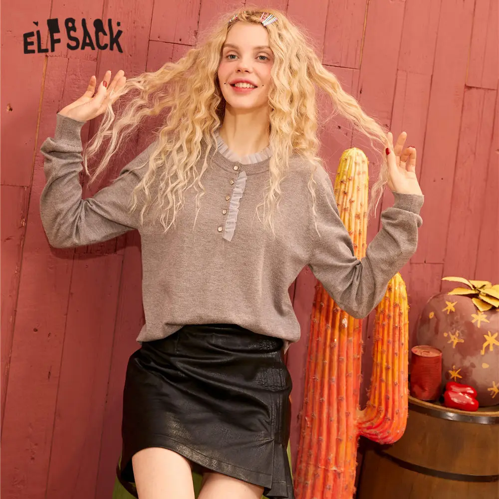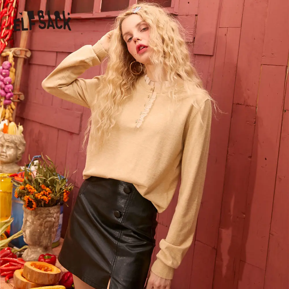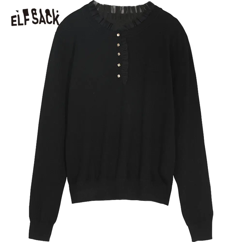 Женский вязаный пуловер ELFSACK, черный однотонный Повседневный пуловер с оборками на воротнике, весенний серый однотонный топ с длинными рукавами, 2020
