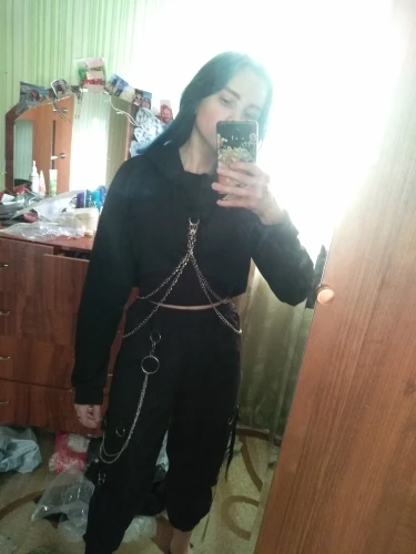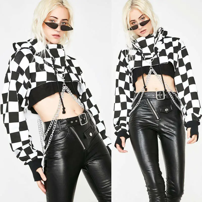 Женская сексуальная Готическая клетчатый короткий Топ Толстовка с цепочкой джемпер с длинным рукавом пуловер с капюшоном Повседневный Свитшот уличная одежда