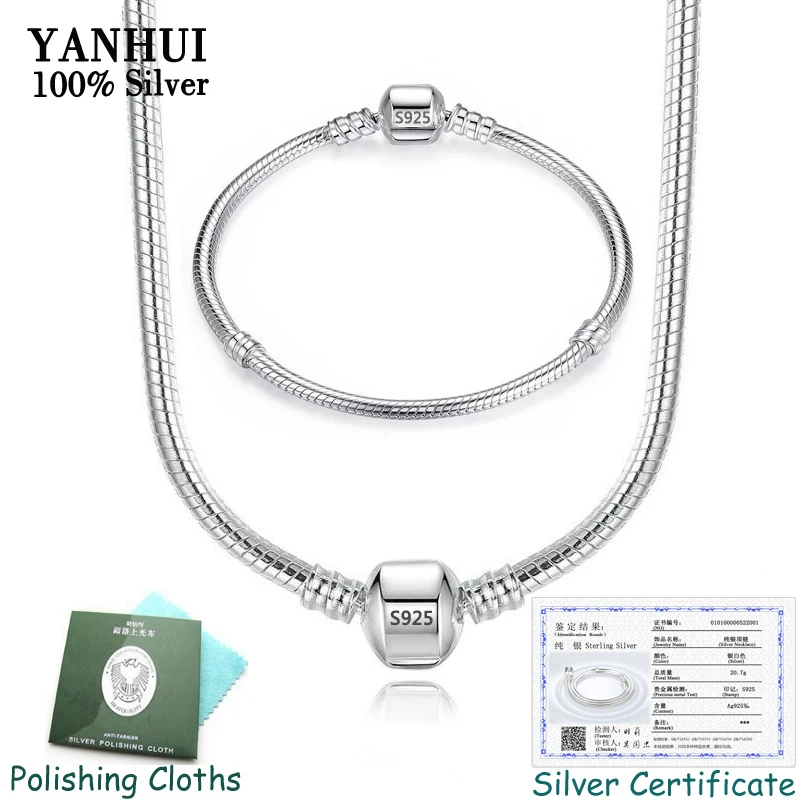 YANHUI с сертификатом, оригинальный, 925 Стерлинговое Серебро, цвет набор украшений для женщин, тонкая, 3 мм, цепочка, ожерелье, браслет, набор ST005