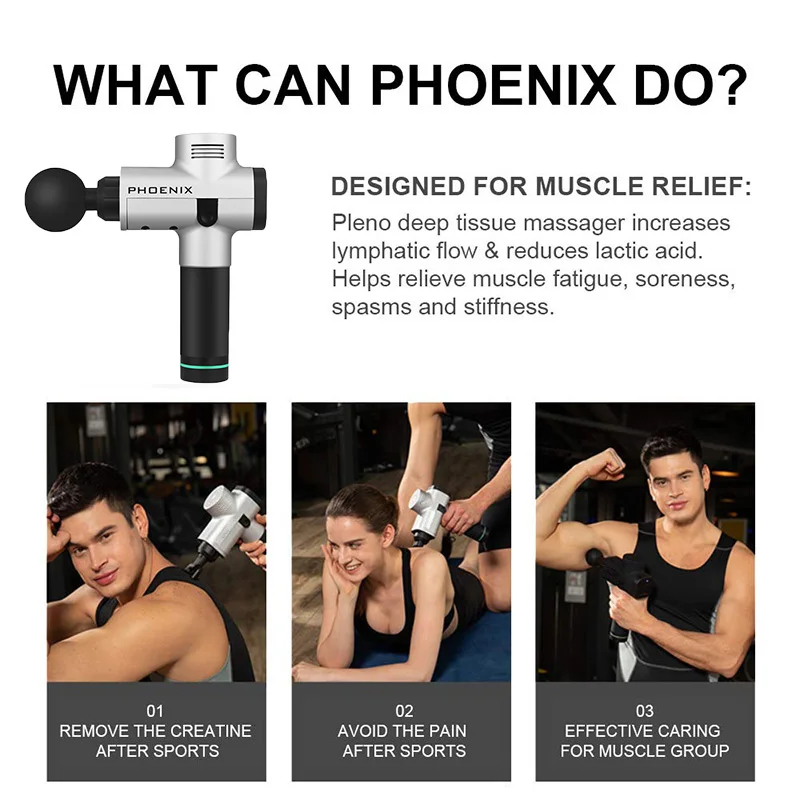 【Многофункциональный массажный пистолет 】: массажный пистолет Феникс используется для снятия мышечной жесткости и боли, способствует циркуляции крови и лимфы. Для спортсменов это может ускорить восстановление после тренировки и тренировки травм. Для личного или самостоятельного использования, это ФИЗИОТЕРАПЕВТИЧЕСКИЙ пистолет, который может улучшить общее здоровье мягких тканей тела, предотвратить воспаление, вызванное адгезией между фасцией и мышцами.