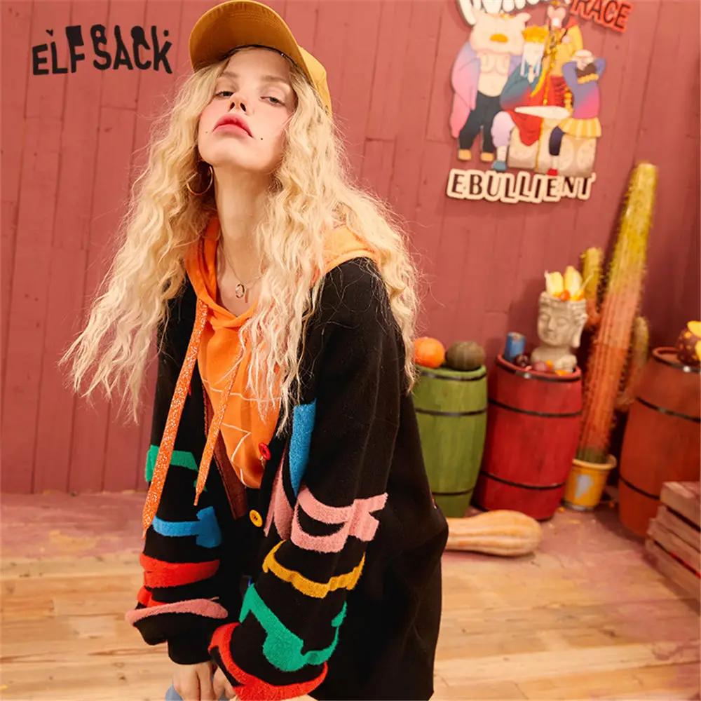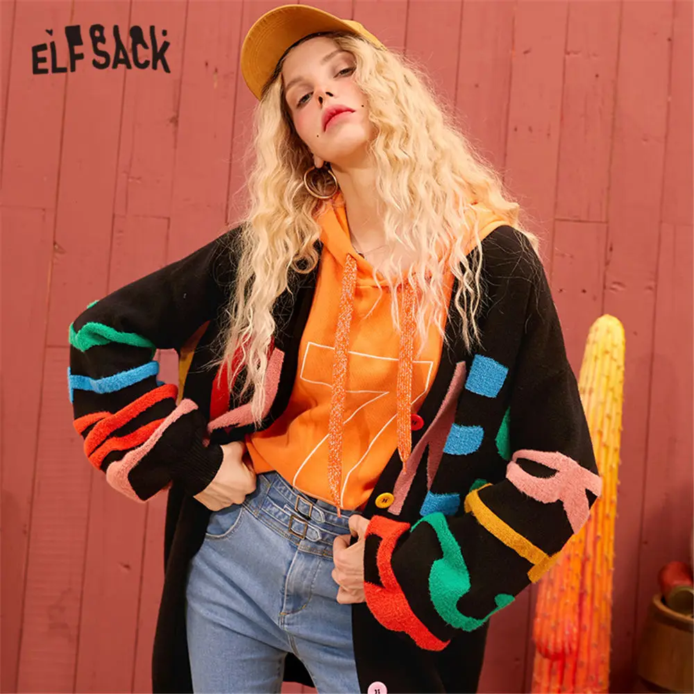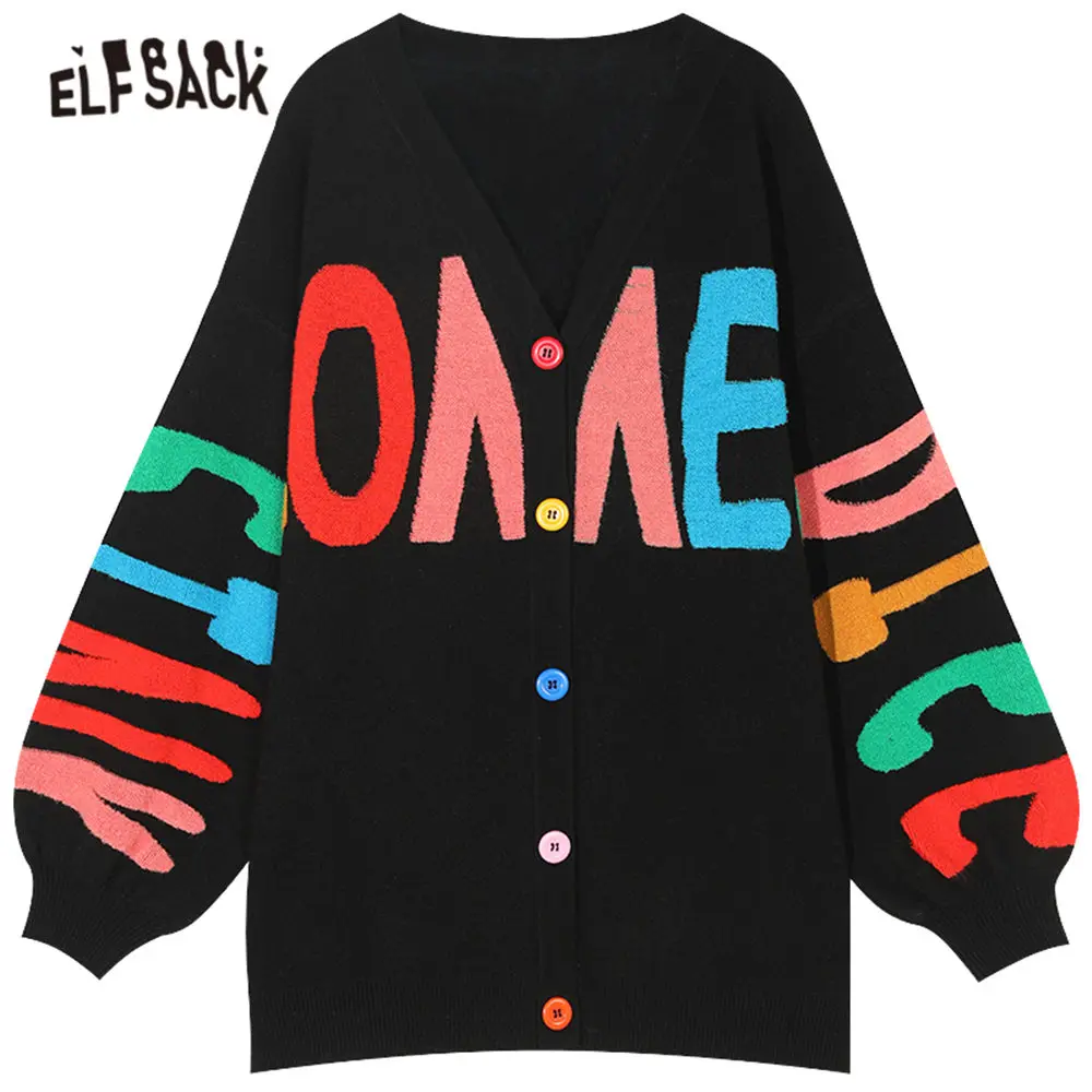 Женский трикотажный кардиган ELFSACK, Черный Повседневный однобортный Кардиган с рукавами-фонариками и аппликацией, весна 2020