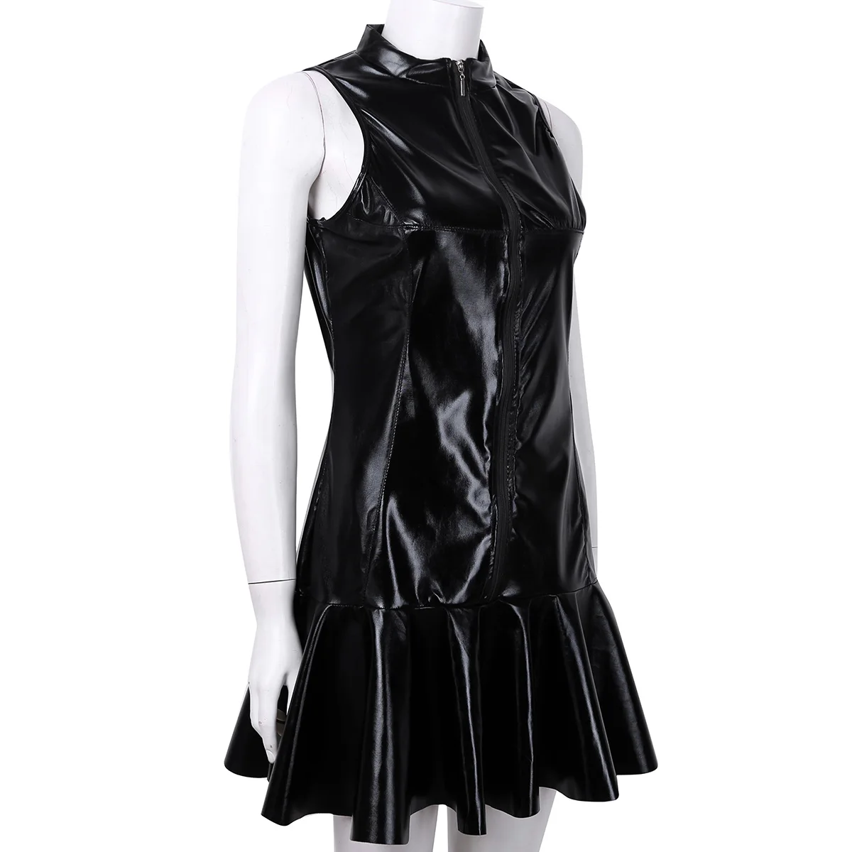Женское модное эластичное мини-платье из искусственной кожи с расклешенной подошвой для клуба. Без рукавов, высокий воротник и Длинная черная молния спереди, которая ходит от пупка до шеи, поставляется с стрингами. Мини-юбка в стиле катания на коньках, легкая, мягкая и удобная в носке. Подчеркивает ваши очаровательные изгибы, отлично подходит для ночного клуба, вечевечерние, коктейля, повседневной носки и т. д. Пожалуйста, внимательно проверьте таблицу размеров перед заказом. Ручная стирка в холодной воде, сушить в подвешенном состоянии.