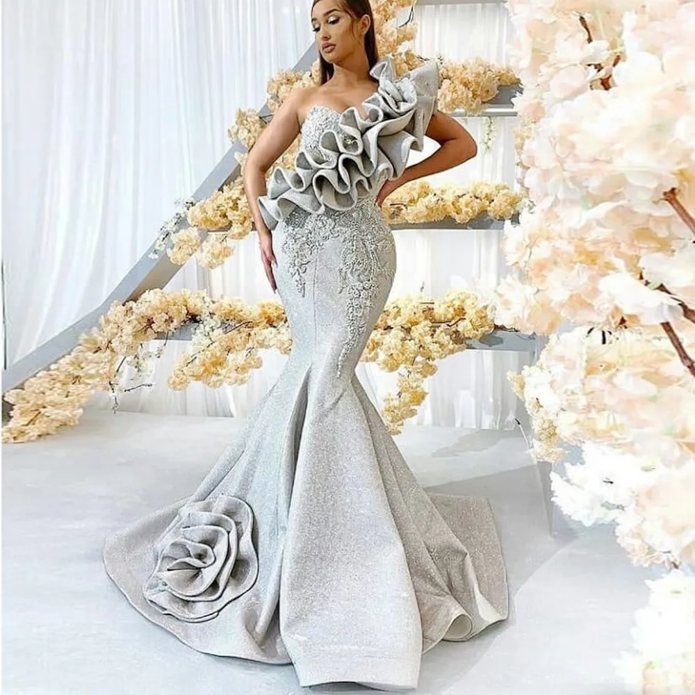 Женское вечернее платье-русалка, серебристое платье с оборками, баской и аппликацией, бальное платье для выпускного вечера