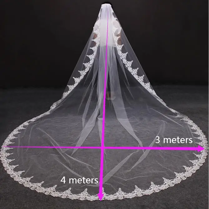 Длина свадебной вуали составляет 4 метра.Ширина 3 метра