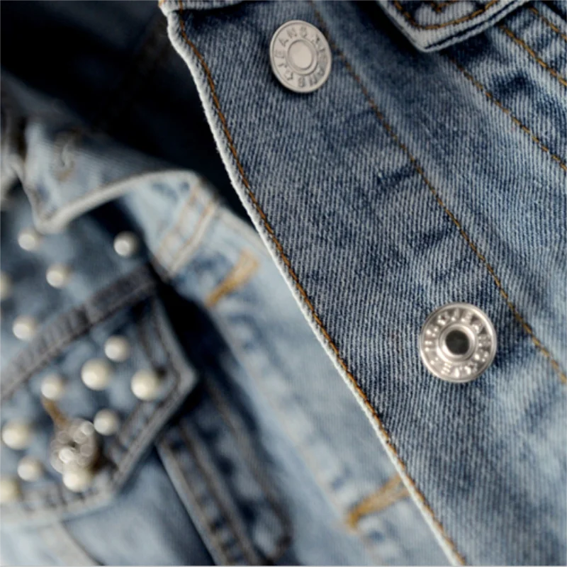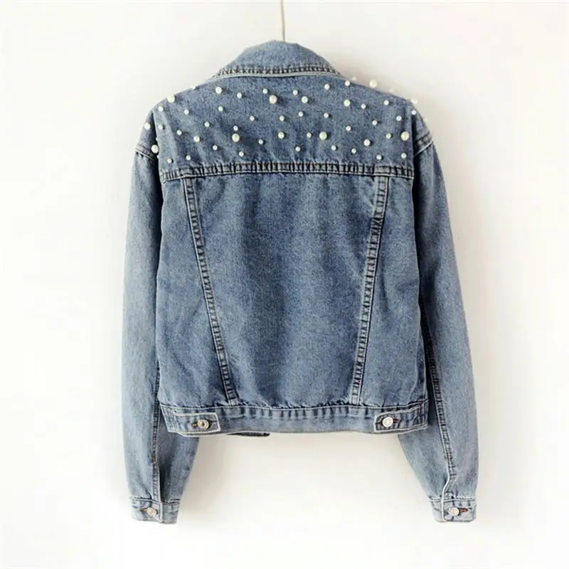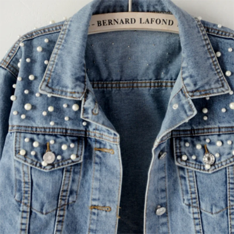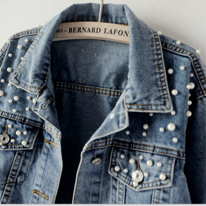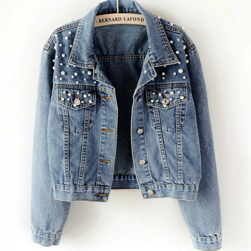 Женская короткая джинсовая куртка, винтажная голубая потертая куртка-бомбер с длинным рукавом, с жемчужным бисером, 2020