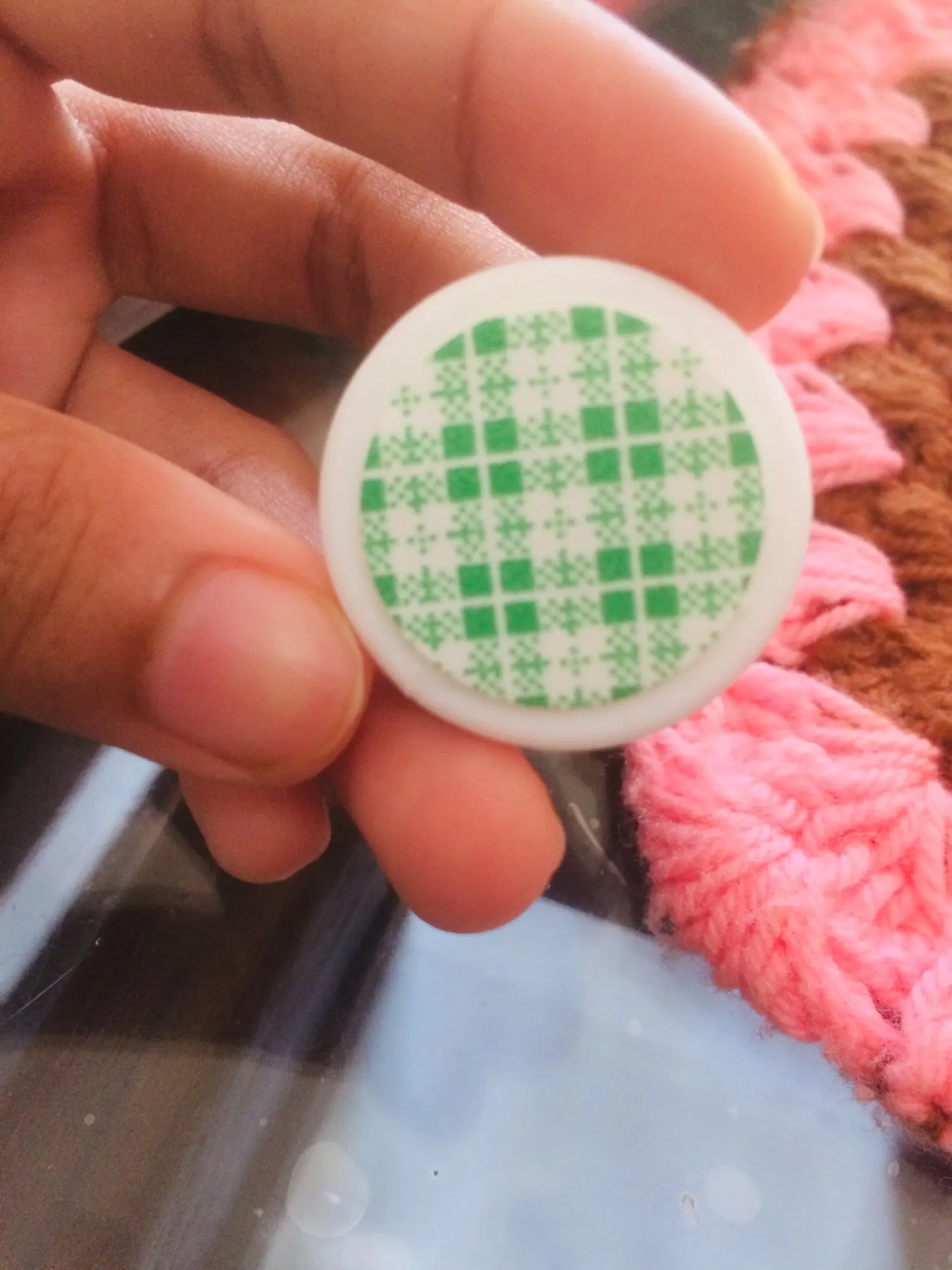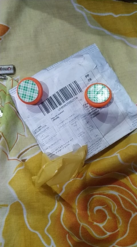 Размером с 5рублевую монету, если поднести к носу, можно услышать небольшой химозный запах.