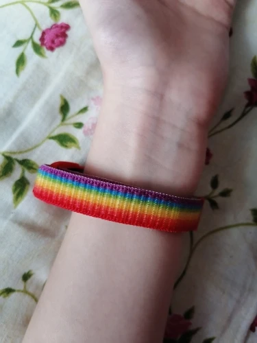 Выбирала радужную расцветку. Товар соответсвует фотографии. Сам браслет тканевый и регулируется при помощи липучек.