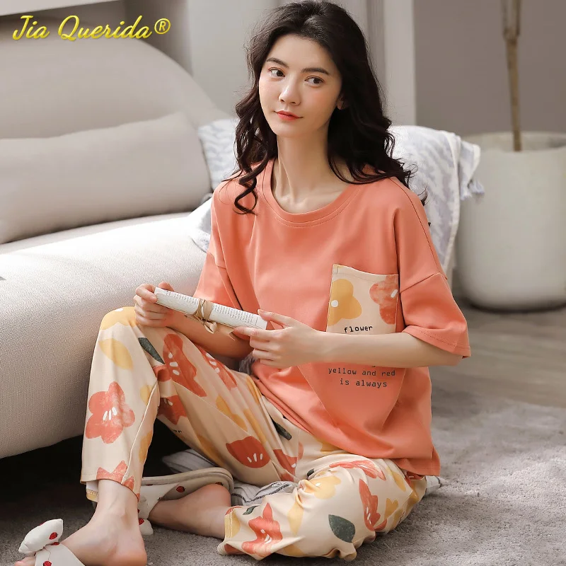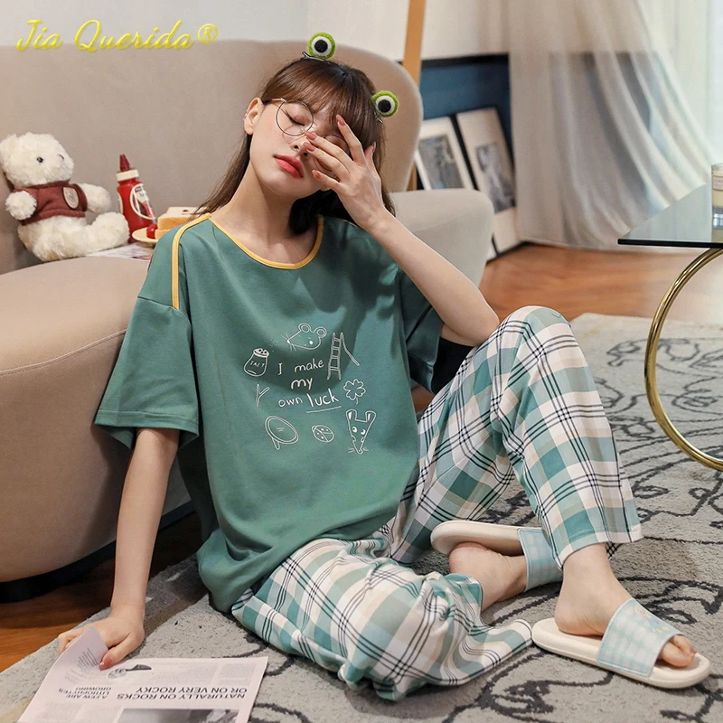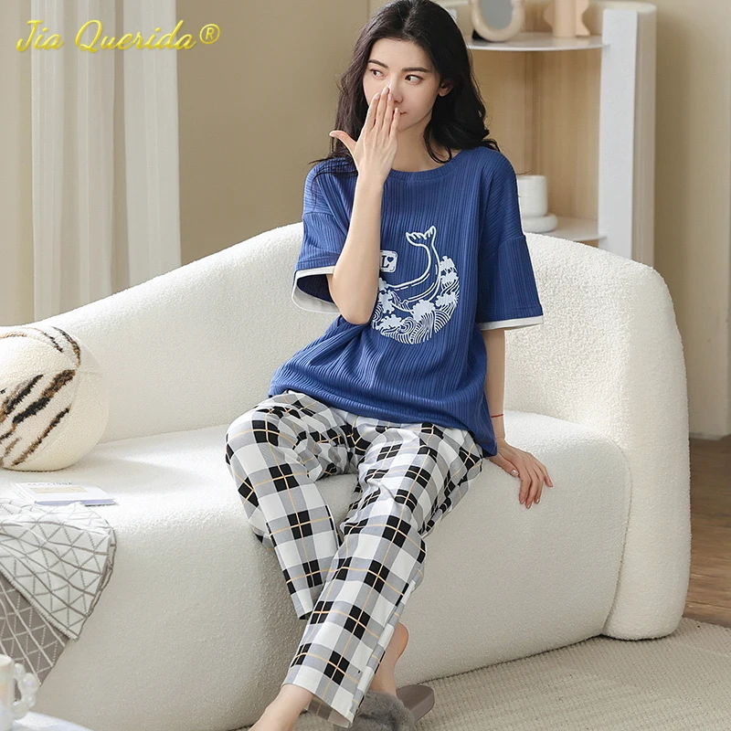 Весенняя Свободная Женская одежда с вырезом лодочкой, пижамы для женщин, домашняя одежда, пижамы, одежда для сна, клетчатые брюки с коротким рукавом, домашняя одежда