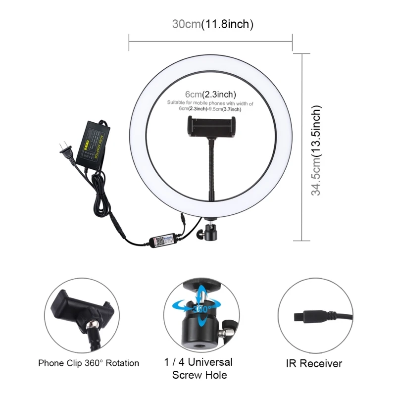 Особенности 1. Светодиодный кольцевой светильник можно установить на держатель и взять с собой куда угодно, его также можно снять с подставки в любое время, шаровая Головка штатива может вращаться на 360 градусов, можно свободно регулировать под любым углом (держатель в комплект не входит). 2. Кольцевой Светильник изготовлен из 75 энергосберегасветодиодный ных лампочек, отлично отводит тепло, обеспечивает постоянный ток и высокую цветопередачу, смягчает источник светильник и улучшает тон кожи при портретной фотографии. 4. Режим освещения RGB, регулируемая яркость на ваш выбор, вы можете очень легко настроить цвет и яркость, идеальной яркости можно достичь без установки дополнительных цветных фильтров. Различные цвета мягкого естесветильник осветят вашу красоту в разных ситуациях. 5. Широкое Применение: широко применяется для наружного светильник щения фотографий, заполнения светильник в помещении, портрета, моды, рекламной фотографии, съемки видео и т. д. 6. Легкий и портативный дизайн: удобно использовать и носить с собой, когда вы путешествуете или работаете на открытом воздухе и т. д. 7. Функция отвода тепла: металлический корпус, даже если он используется в течение длительного времени, можно не беспокоиться, что лампа нагреется. 8. Зажим для телефона подходит для мобильного телефона шириной 5,7-9 см. 9. С новейшим беспроводным умным светодиодом Bluetooth 4,0, полноцветным RGBW заполняющим светом для различных сцен, с помощью Android 4,0 и выше, умные устройства iOS iPhone 4S и выше для управления выключением/включением заполняющего света, регулировки цвета и яркости света Характеристики 1 светодиодный светодиодные бусины: 75 шт SMD 5050 RGBW 2. Мощность: 30 Вт 3. Цвет светильник: RGB + белый 4. Режимы управления: приложение Bluetooth, дистанционное управление 5. Режимы удаленных функций: 20 статических цветов и 6 динамических цветов 6. Режимы работы приложения: режим регулировки цвета, музыкальный режим, режим голосового управления, режим таймера 7. Дистанционное расстояние: 5-10 м 8. Метод сигнала: Инфракрасная радиочастота 9. Цвет света: -Красный: длина волны 620-625 нм, световой поток 600 мкд/лм -Зеленый: длина волны-нм, световой поток мкд/лм -Синий: длина волны-нм, световой поток мкд/лм -Белый: Цветовая температура 6000-6500k