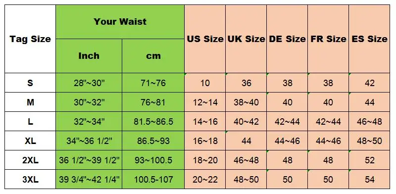 Если вы находитесь на границах между двумя размерами, вам лучше выбрать следующий размер. Местный размер (размер США, Размер Великобритании...) основан на размере одежды и только для справки, пожалуйста, проверьте измерение талии перед покупкой. Обхват талии Размеры S 28 "~ 30" (дюйм) 71 ~ 76 (см) M 30 "~ 32" (дюйм) 76 ~ 81 (см) L 32 "~ 34" (дюйм) 81,5 ~ 86,5 (см) XL 34 "~ 36 1/2" (дюйм) 86,5 ~ 93 (см) 2XL 36 1/2 "~ 39 1/2" (дюйм) 93 ~ 100,5 (см) 3XL 39 3/4 "~ 42 1/4" (дюйм) 100,5-107 (см)