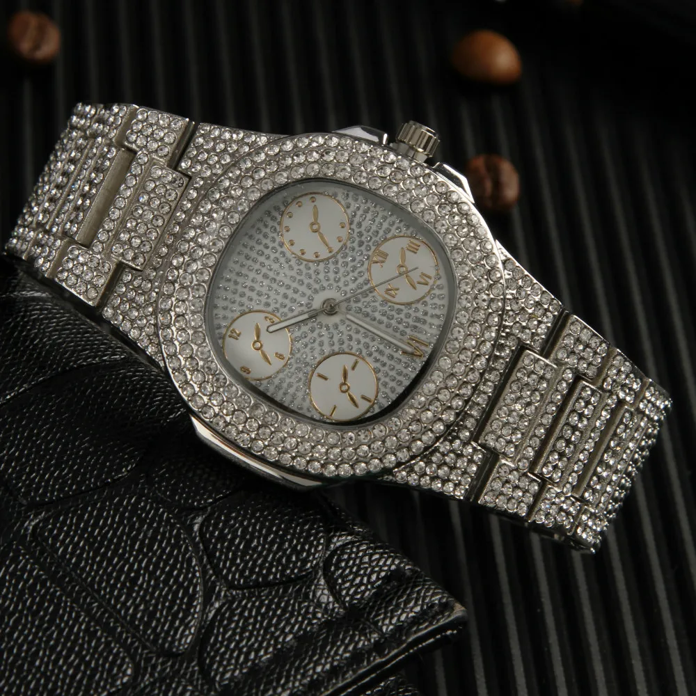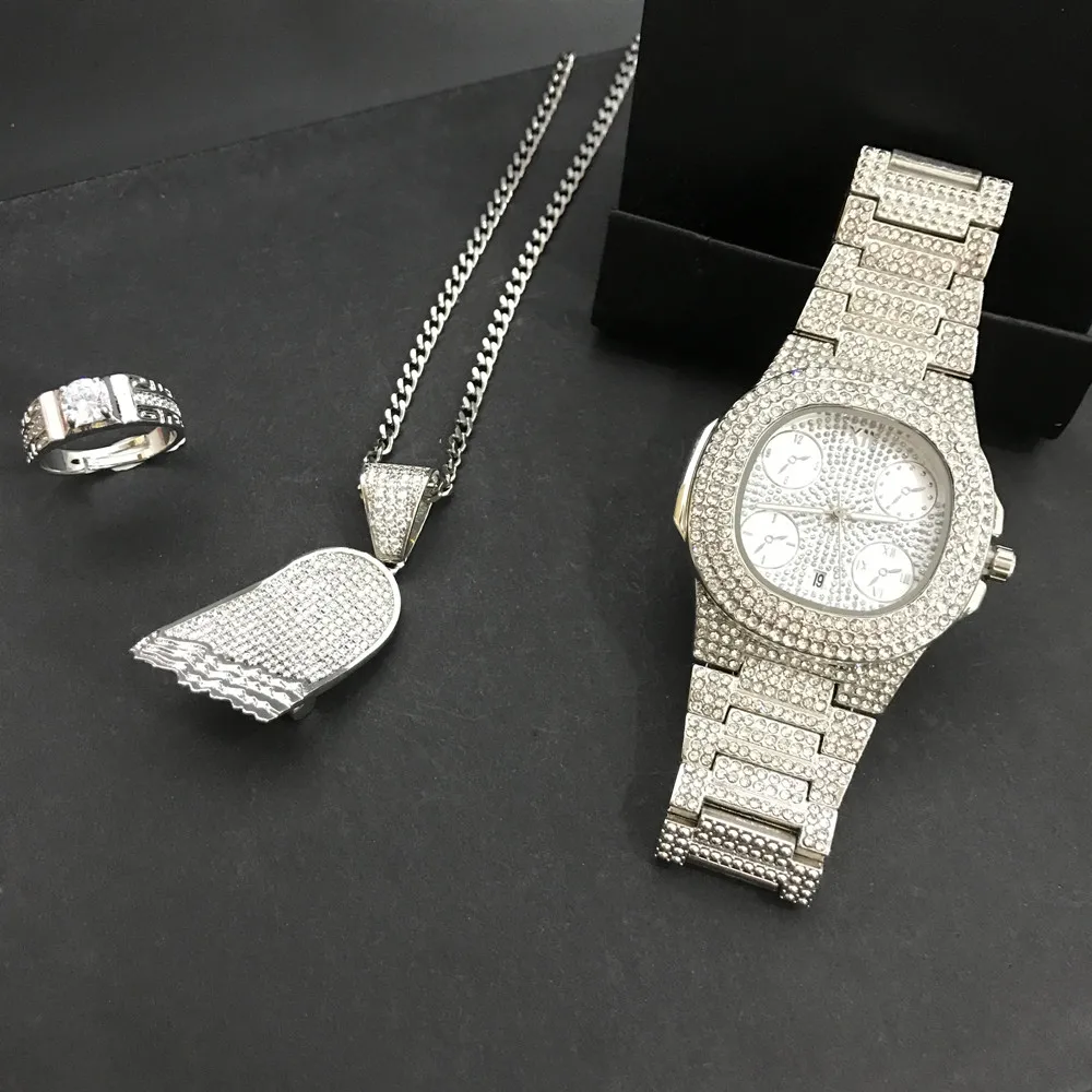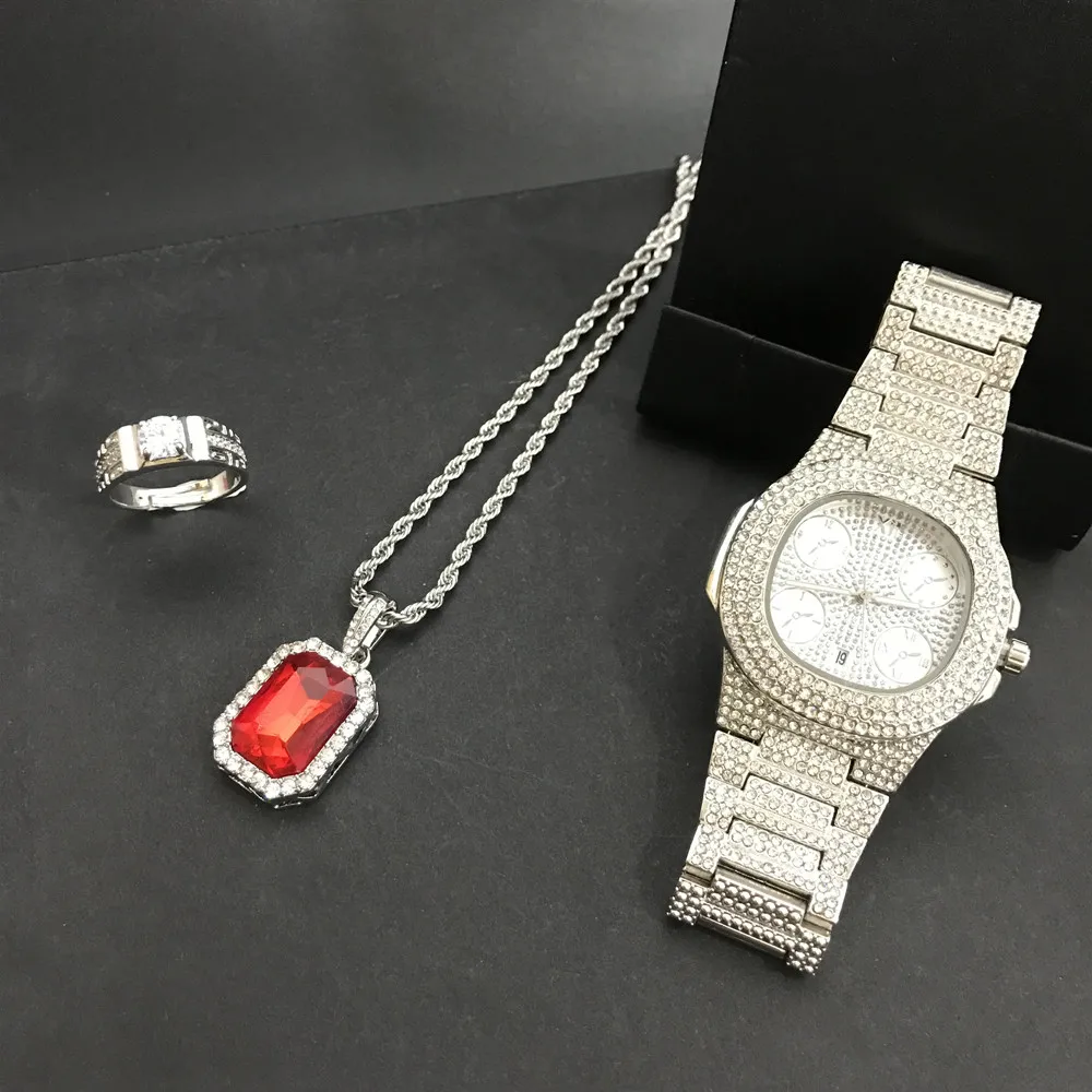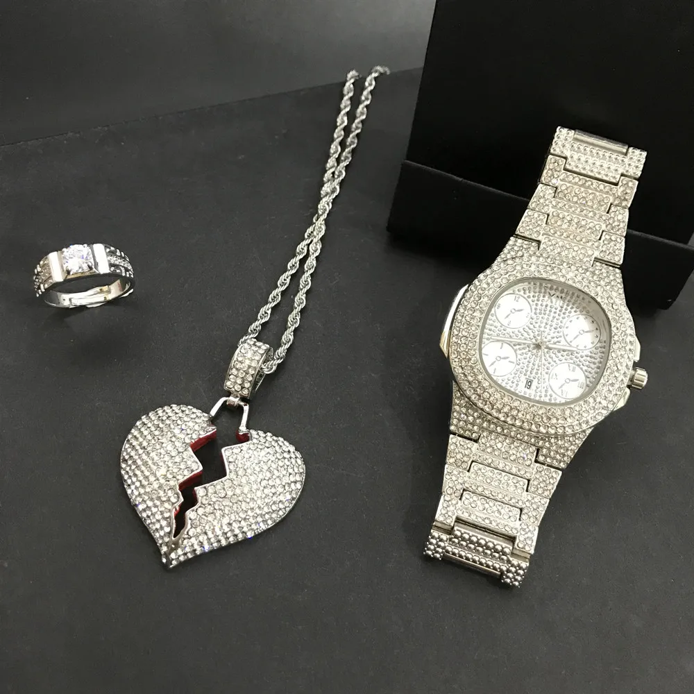 Роскошные мужские серебристые часы в стиле хип-хоп, ожерелье и часы и кольцо, комбинированный набор, ожерелье с кристаллами в стиле хип-хоп