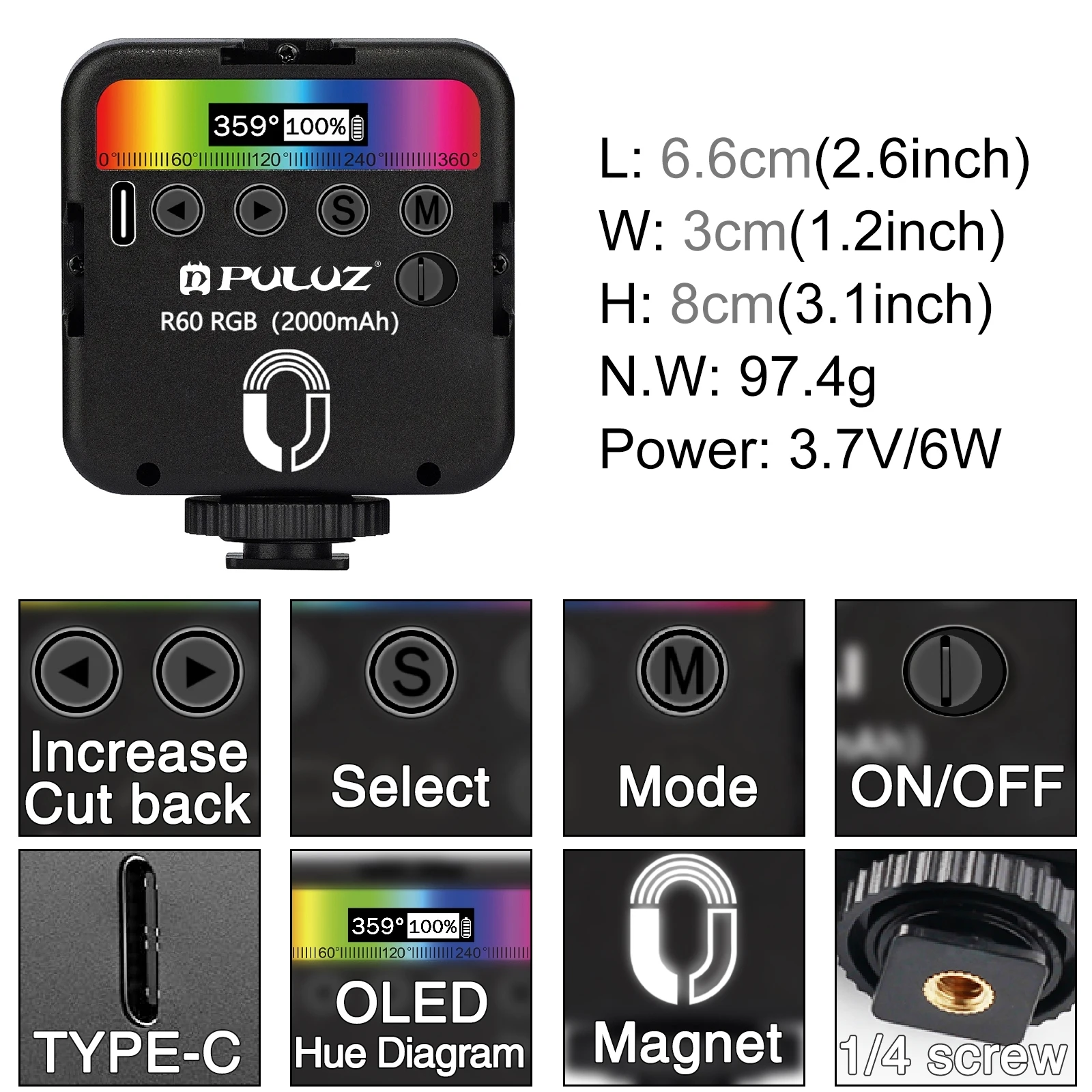 Карманная Светодиодная лампа PULUZ RGB с регулируемой цветовой температурой, с пультом дистанционного управления