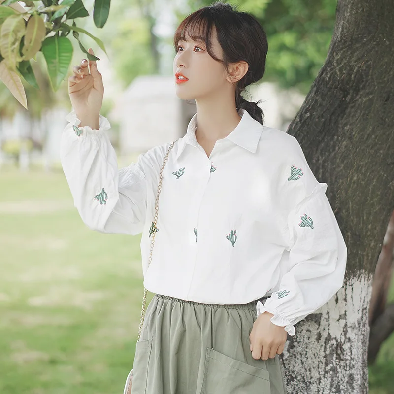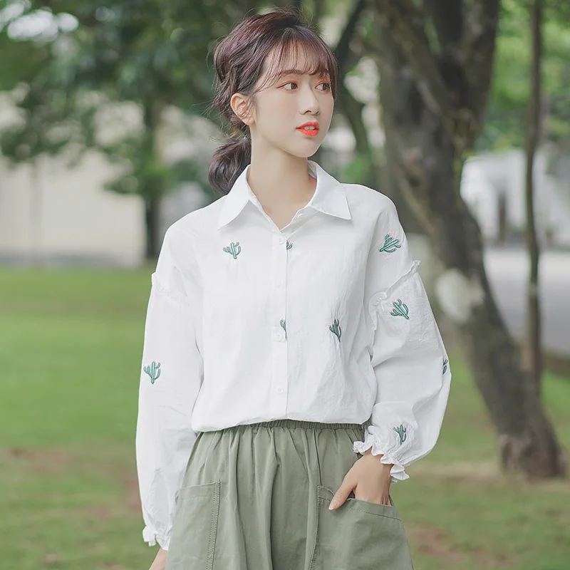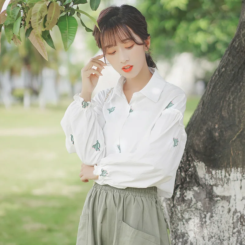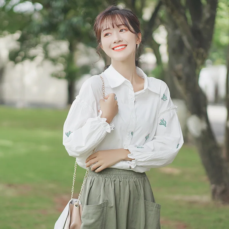 Рубашка женская с расклешенными рукавами, винтажная блузка с отложным воротником и длинным рукавом, с цветочной вышивкой, модный топ с рукавами-колокольчиками в стиле ретро