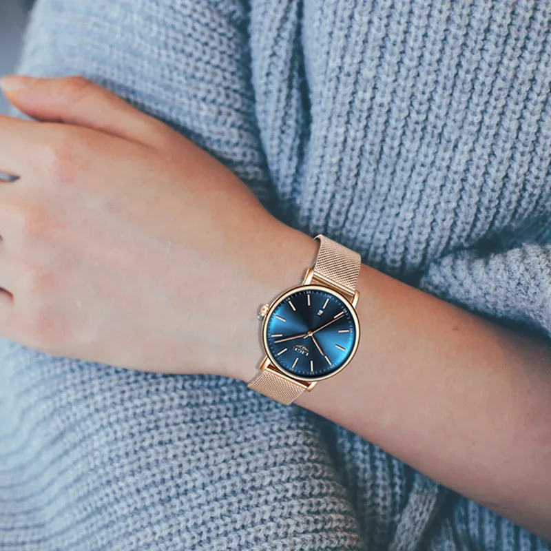 Часы женские, из Миланской стали, розовое золото, кварцевые, в коробке