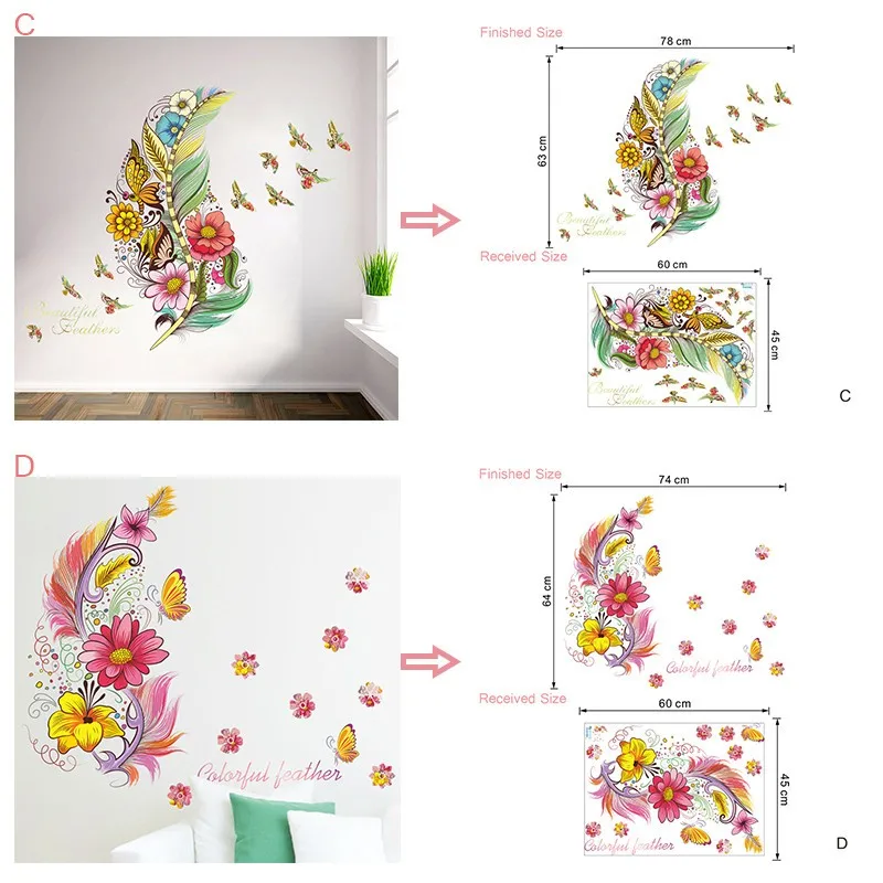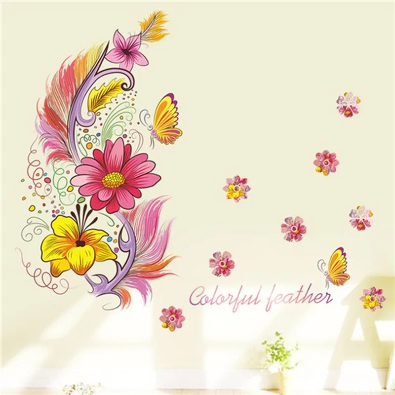 Цветные 3D наклейки на стену с перьями, бабочками, птицами, цветами, украшения для дома, гостиной, ПВХ, Наклейки на стены, Diy, роспись, художественный постер