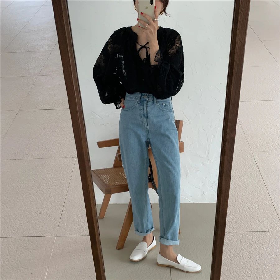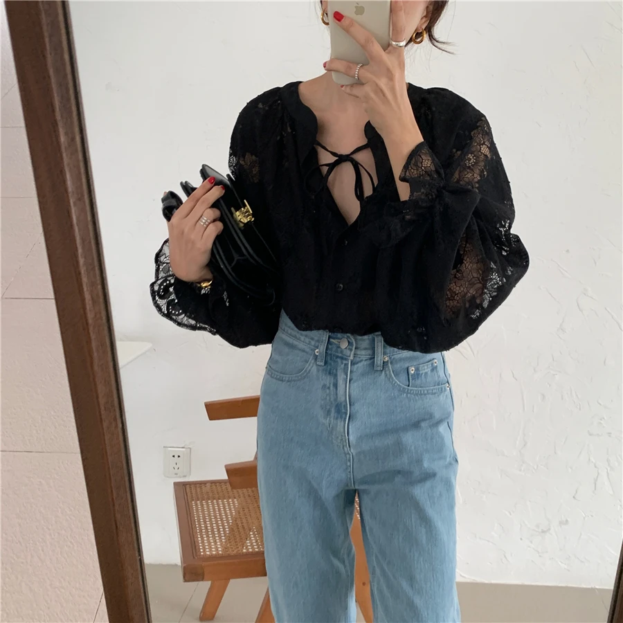 Женские рубашки 2020, модная Свободная блузка с длинным рукавом-фонариком и резным узором, кардиган, одежда, Черная кружевная рубашка, топы 10202