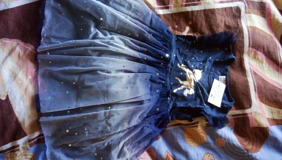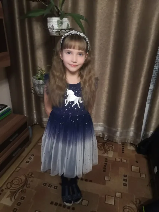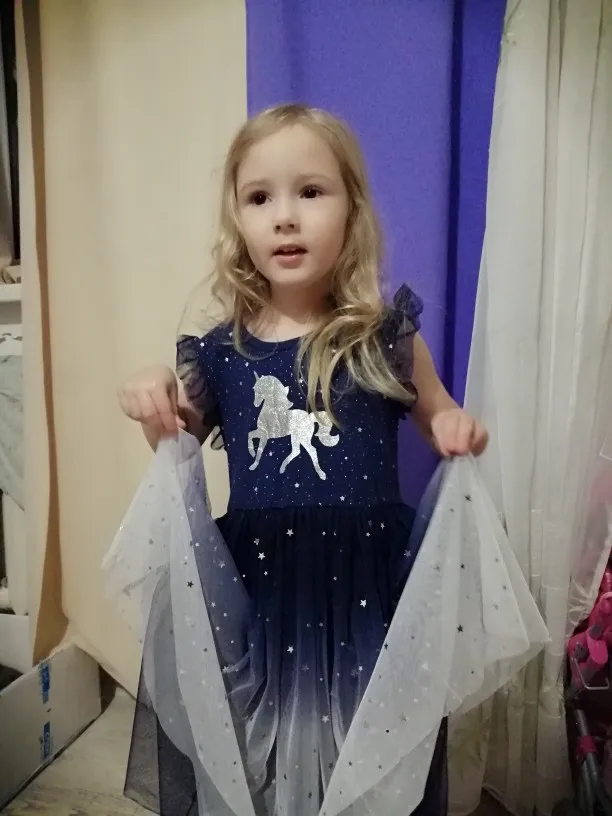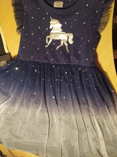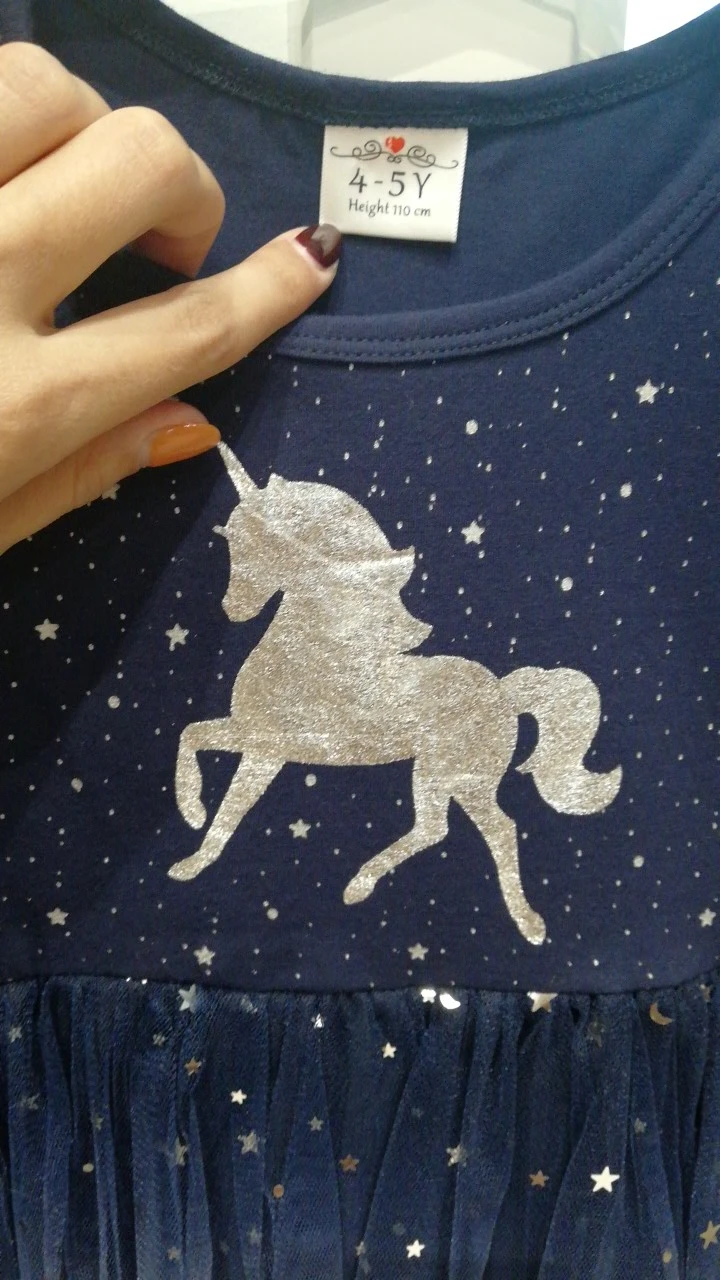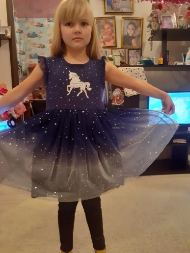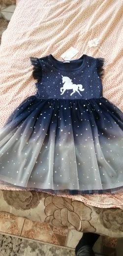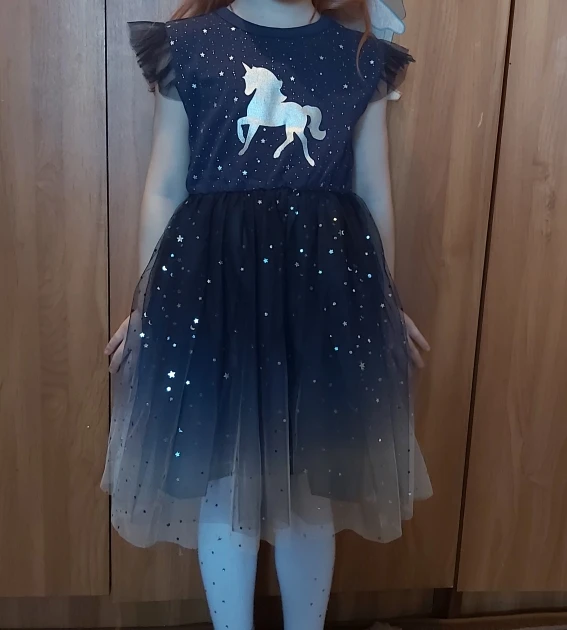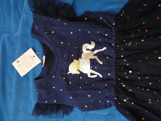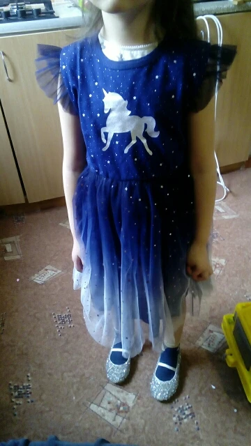 Хорошее платье,подкладка хлопок, ничего не колется. После стирки все звёзды на месте, только единорога чуть пострадал из-за того,что на батарее сушила,но это я сама виновата. На рост 110,вес 16кг размер 5 как раз( на этикетке 4-5 110см).