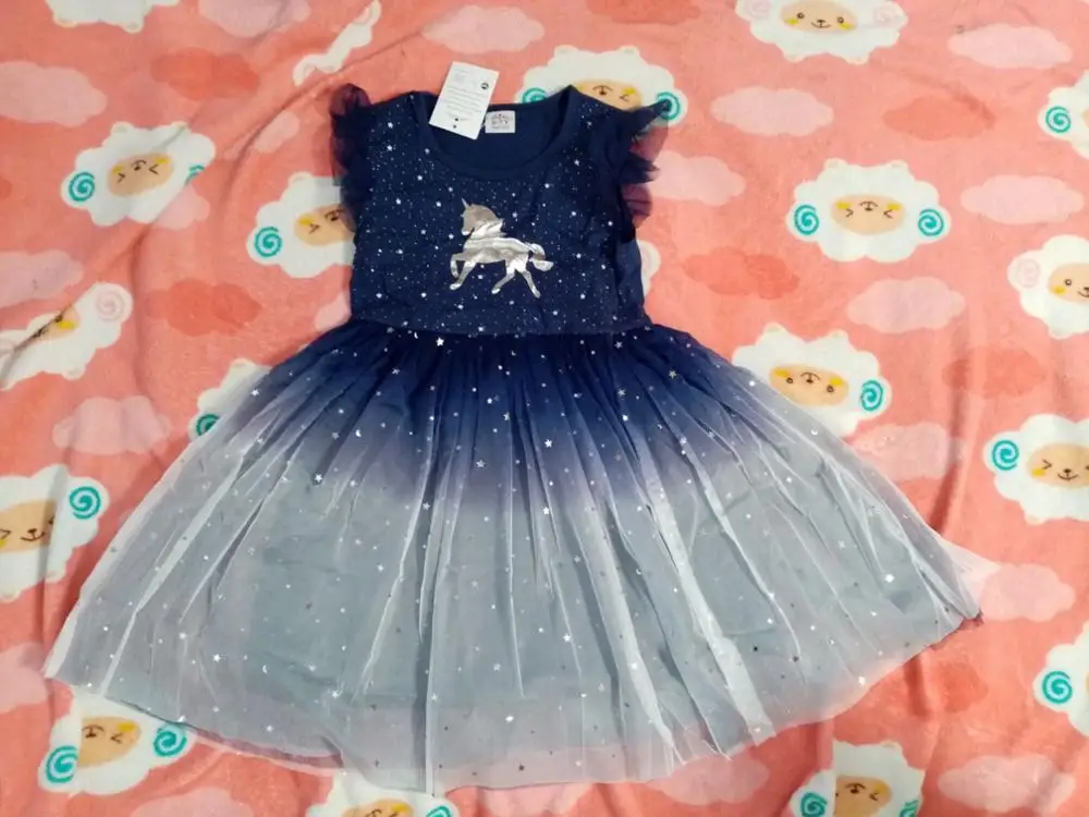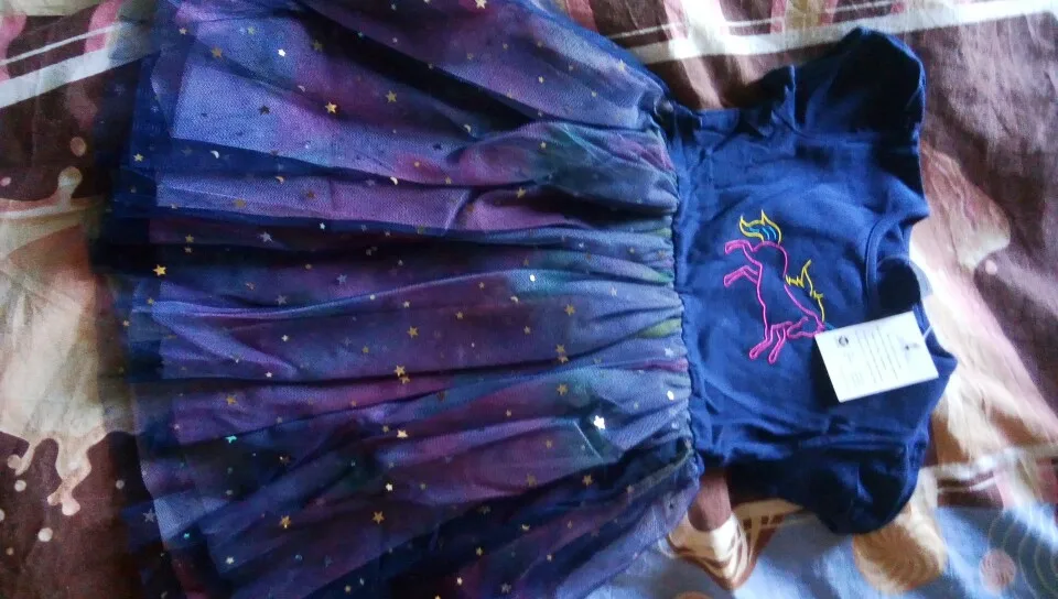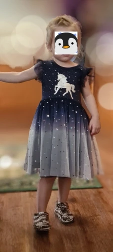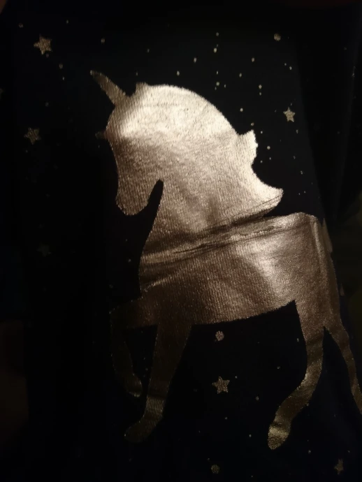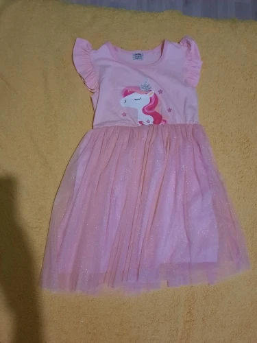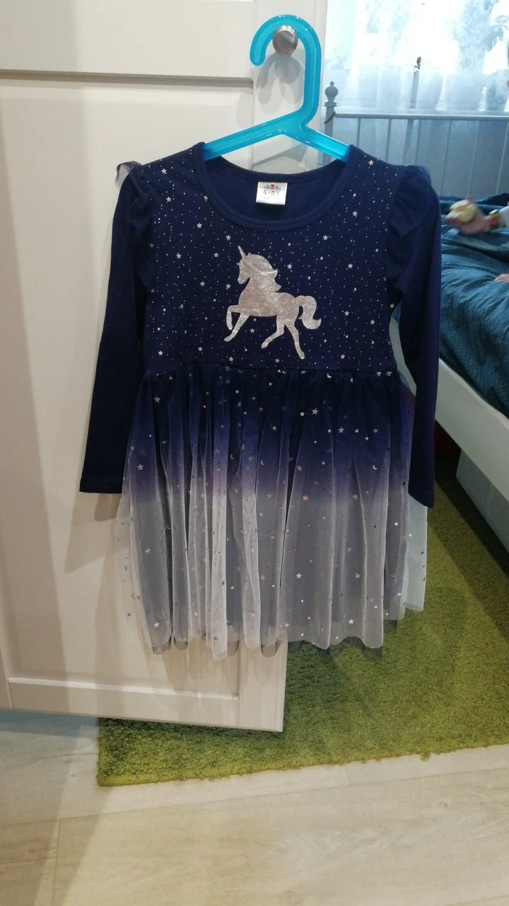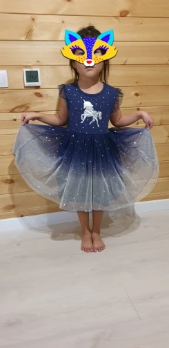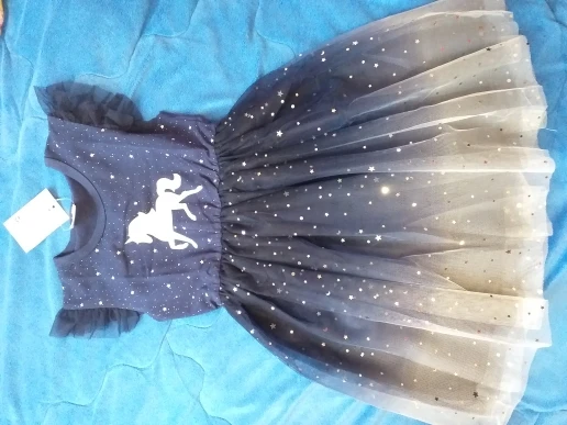 Хорошее платье,подкладка хлопок, ничего не колется. После стирки все звёзды на месте, только единорога чуть пострадал из-за того,что на батарее сушила,но это я сама виновата. На рост 110,вес 16кг размер 5 как раз( на этикетке 4-5 110см).