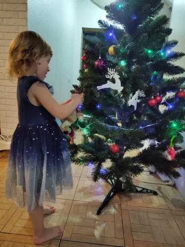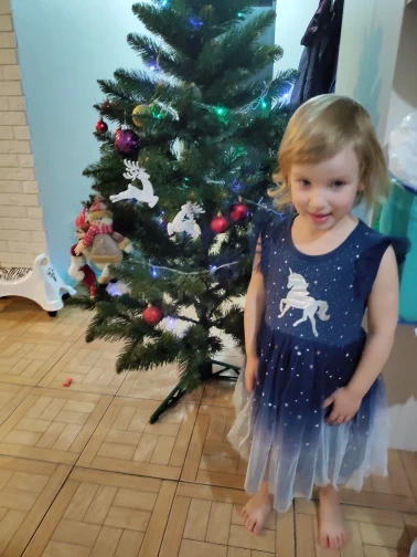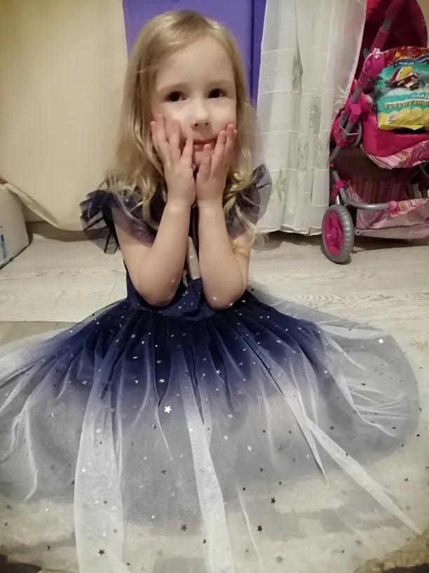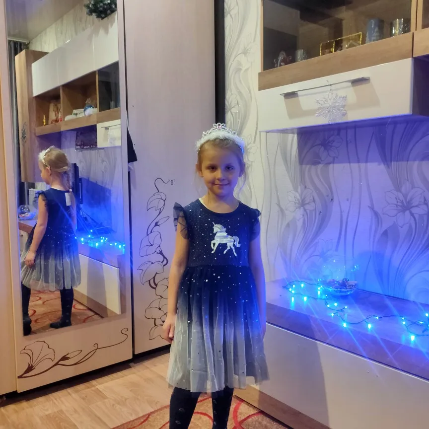 Платье пришло очень быстро, качество среднее. Звездочки, мне кажется, отвалятся после стирки. Потом дополню отзыв. Я его отпарила. Трикотаж приятный к телу. Подъюбник из хлопка. Я ошибочно заказала платье без рукавов, и попросила продавца положить модель с рукавами, огромное ему спасибо, за то что он внимательно отнёсся и выполнил просьбу. На рослую девочку 3 лет подошёл размер 4-5 лет, обычно беру 110 размер.