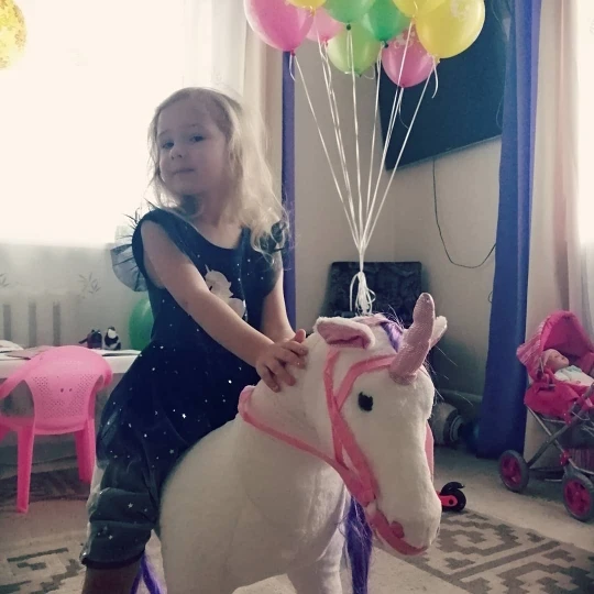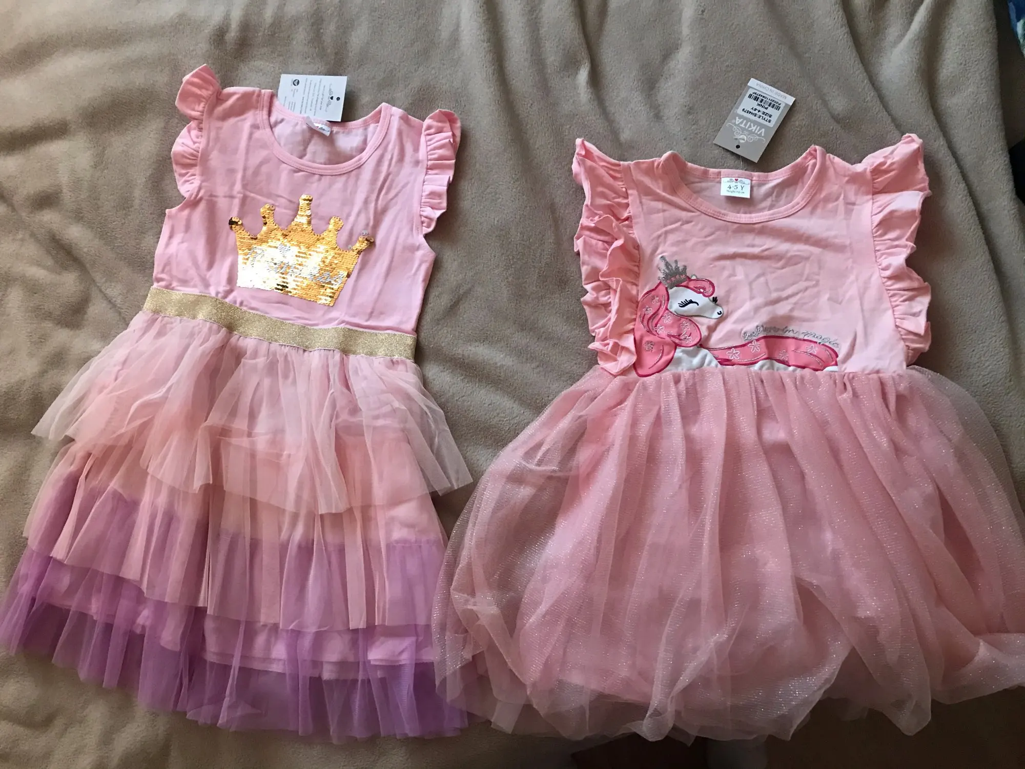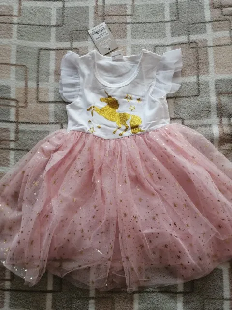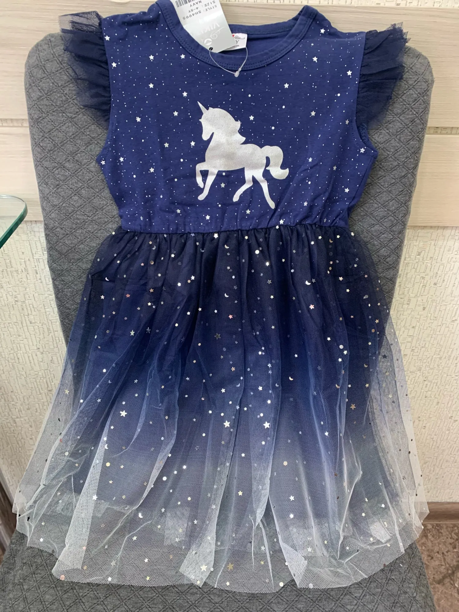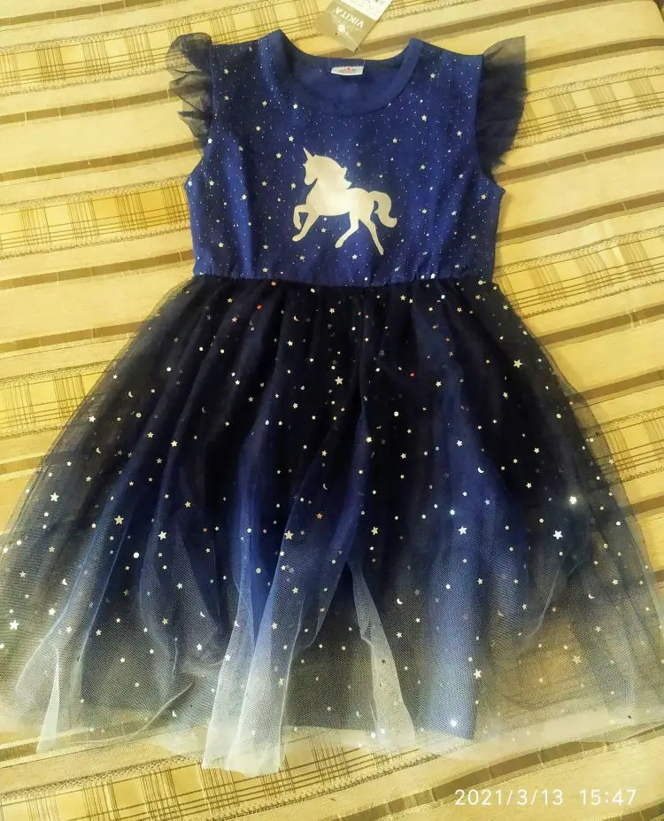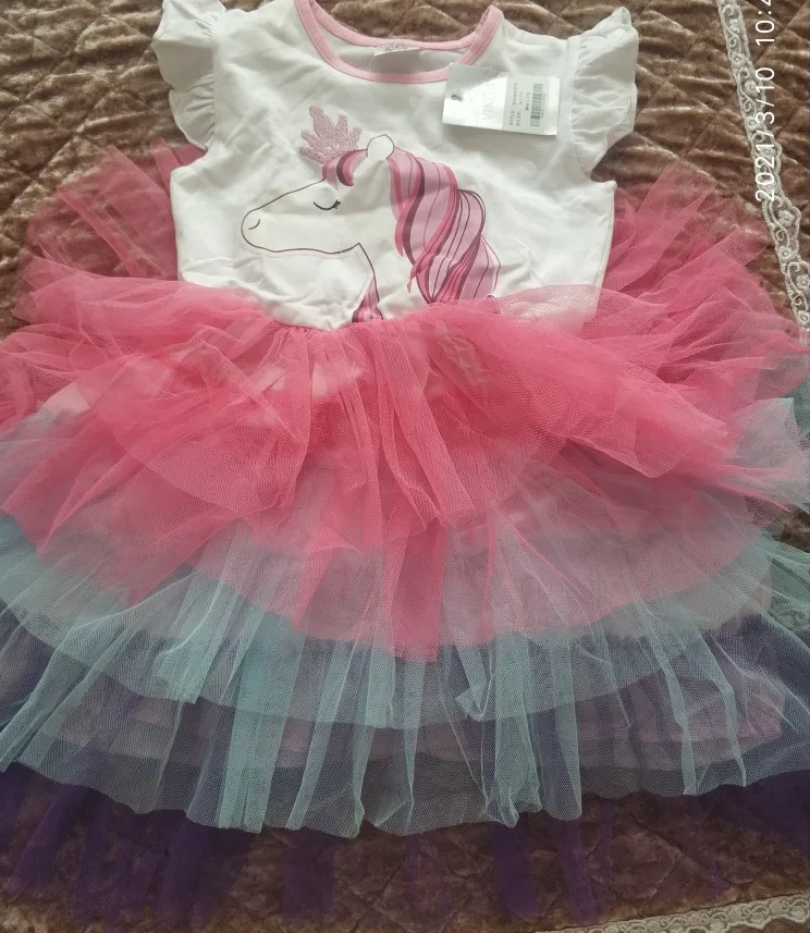 689 рублей. Размер 4-5 лет. На 4 года ровно подошло и ещё на вырост хватит, так как худышка) Платье отпарили, выглядит как в магазине. Стоит в два раза дешевле если не в три) материал приятный, не голимая синтетика. Супер качество. Швы все на месте. Блёстки не отваливаются. Единорог это вообще любовь) большое спасибо вам, ребята китайцы! Дочь снимать не хочет. Принцесса)