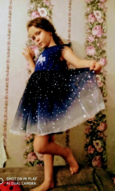 Отличное платье за такую цену. Шло до Белгорода месяц, с продавцом не общался. Верх платья переливается, ребенку нравится