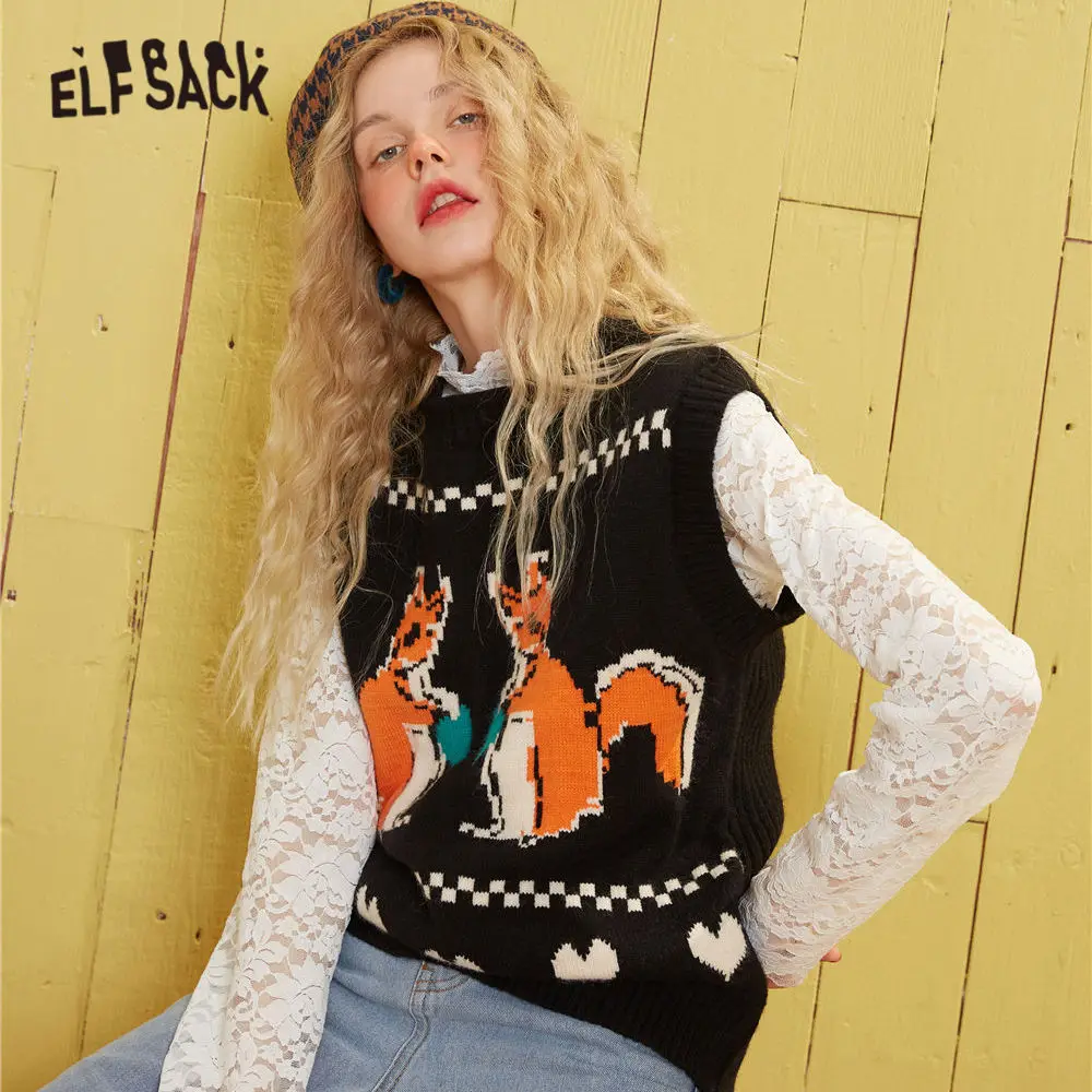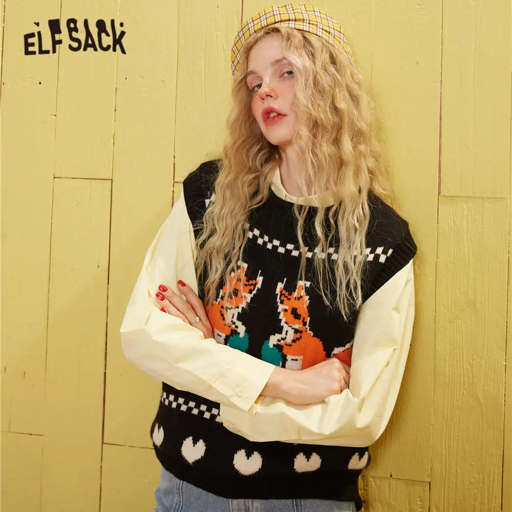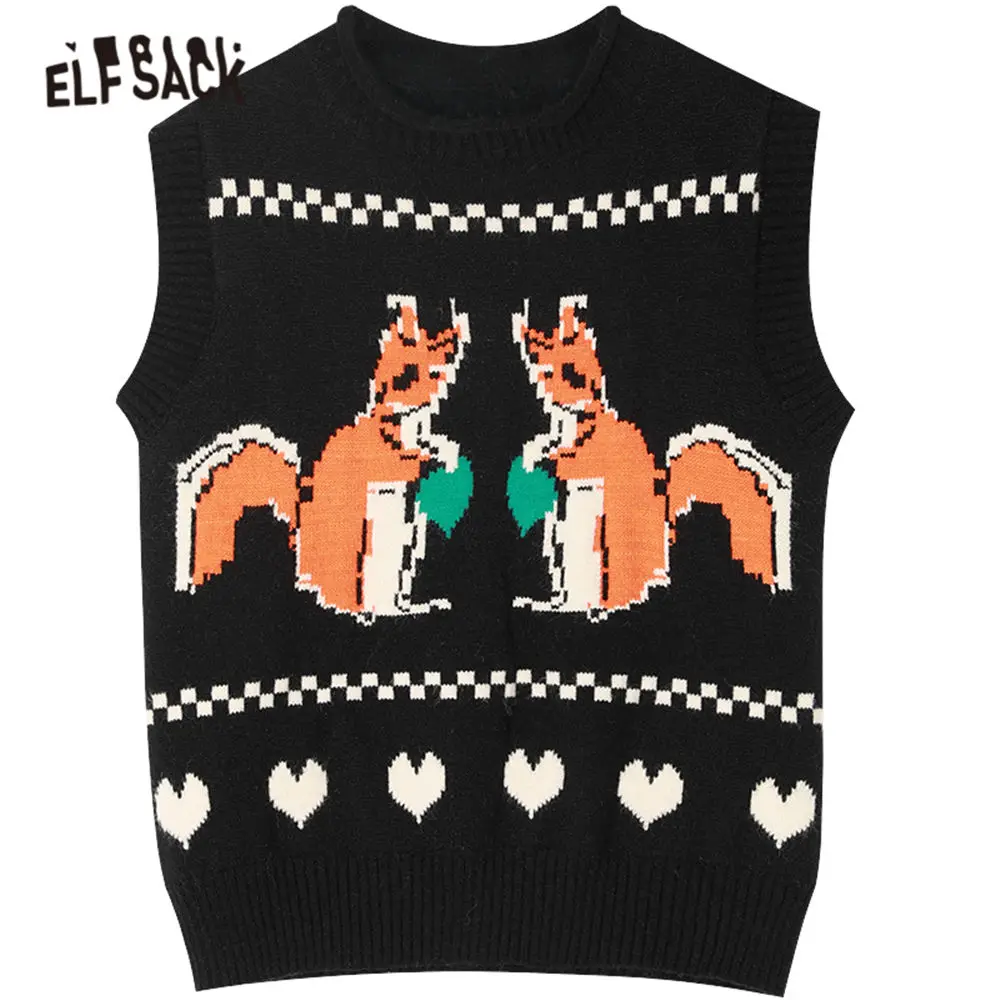 Женский трикотажный пуловер ELFSACK, Черный Принт белки в стиле преппи, свитер без рукавов с v-образным вырезом, Повседневный, зима 2020