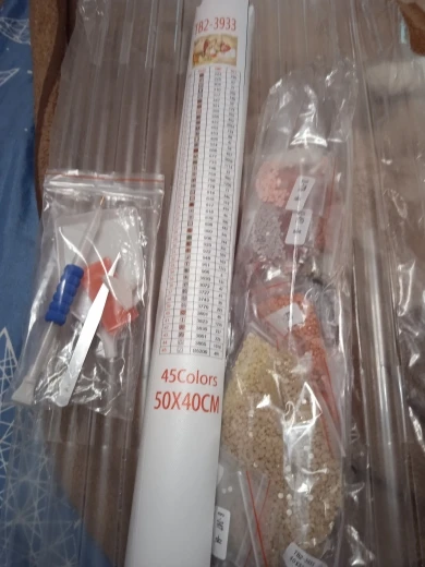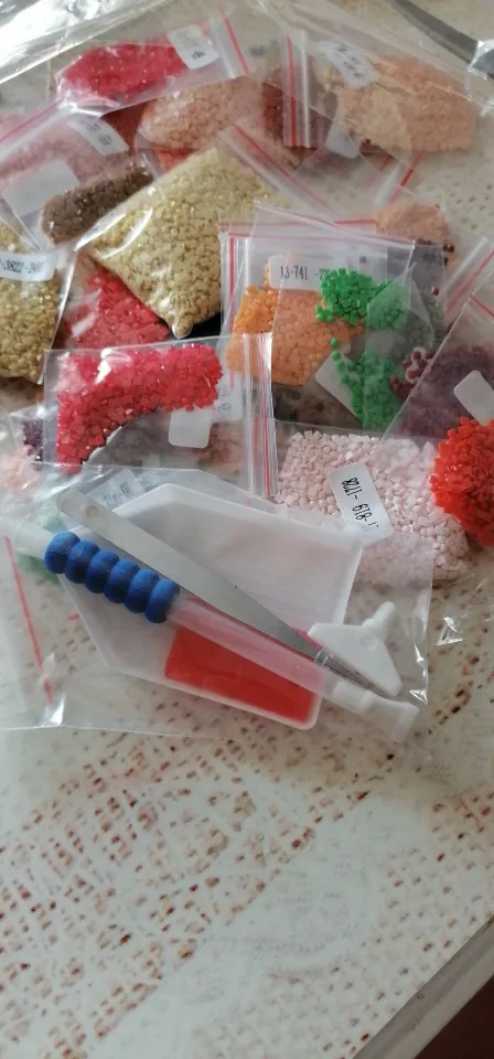 Картина доехала до меня за 2 недели, в точку получения заказа, не через почту. Холст не помялся, все стразы на месте, всего 35 цветов в этом размере. Холст намного плотнее, чем в этом же магазине офишал стор. Как соберу, дополню отзыв.