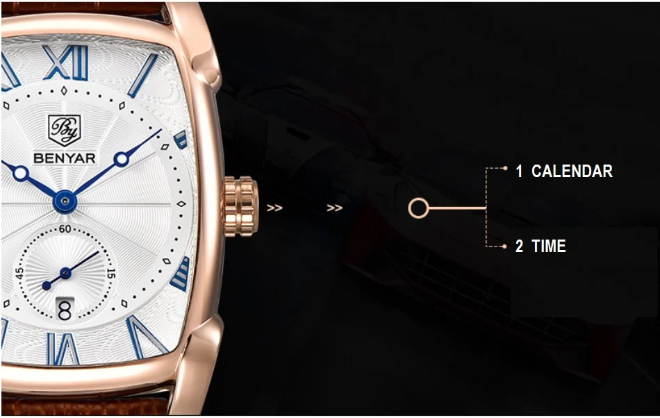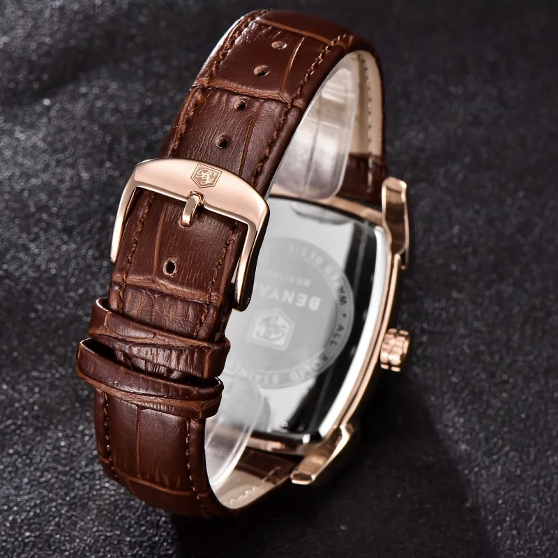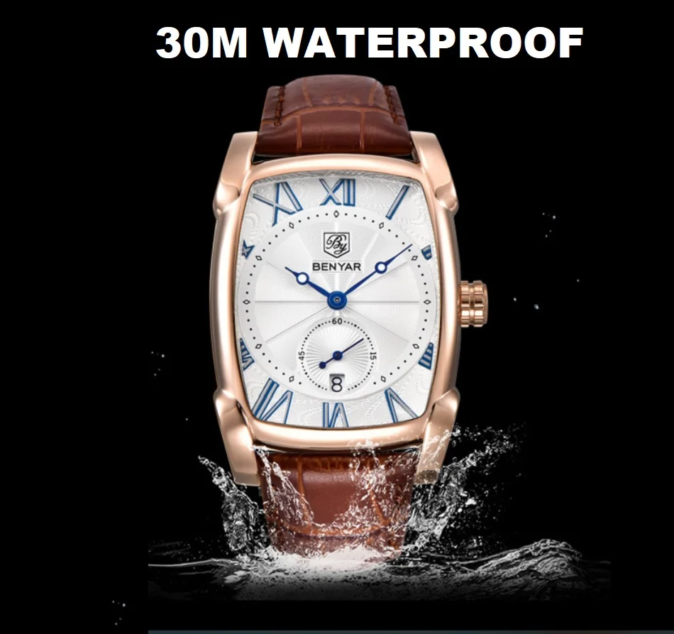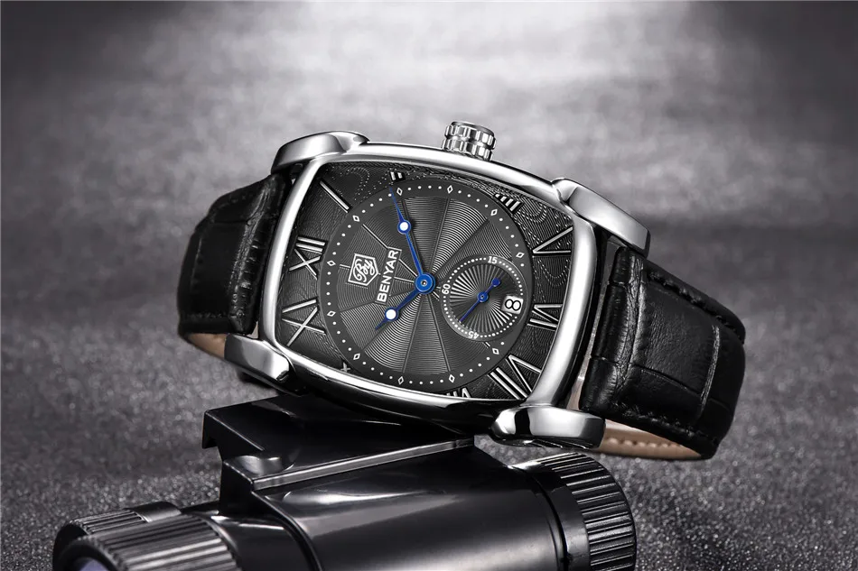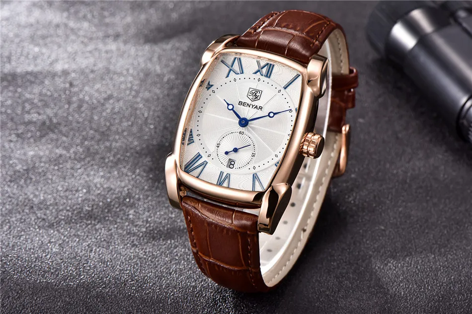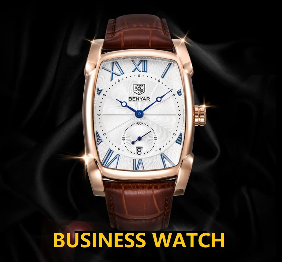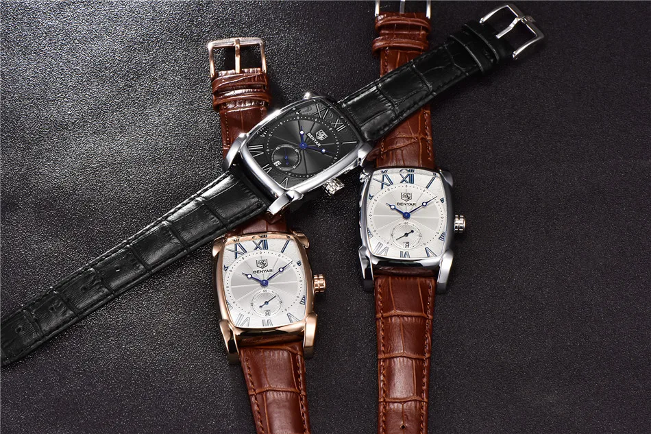 Часы наручные Benyar Мужские кварцевые, квадратные деловые водонепроницаемые с кожаным ремешком