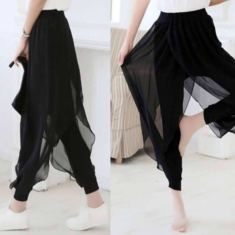 Женские шифоновые брюки, расклешенная юбка с разрезом, широкие брюки палаццо в стиле бохо, свободные штаны, брюки в стиле Харадзюку, для лета
