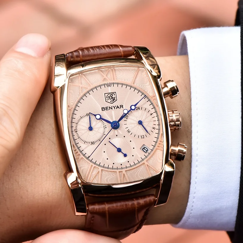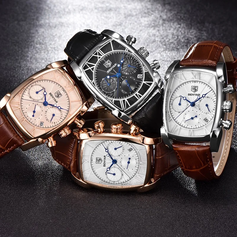 Часы наручные BENYAR Мужские кварцевые, модные брендовые Роскошные водонепроницаемые спортивные с большим циферблатом, в стиле милитари, с кожаным ремешком и хронографом