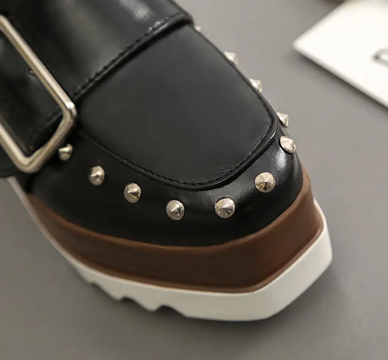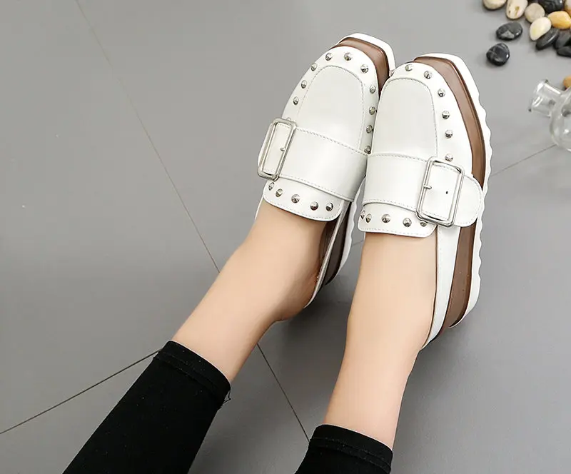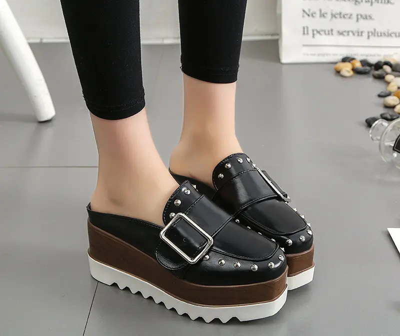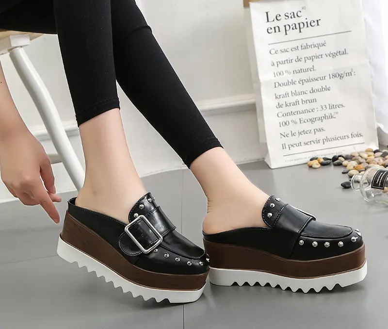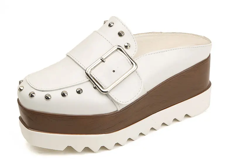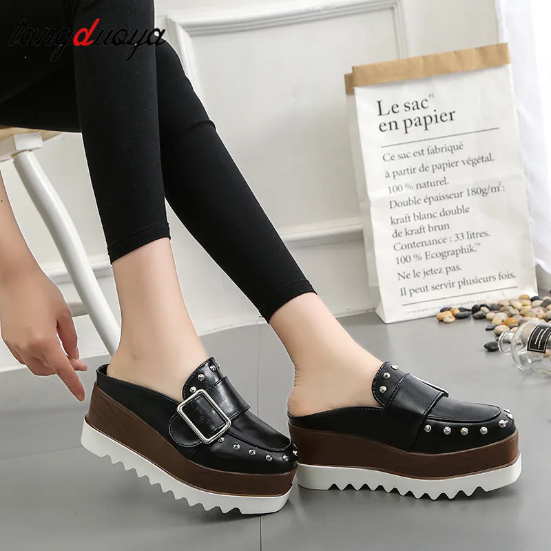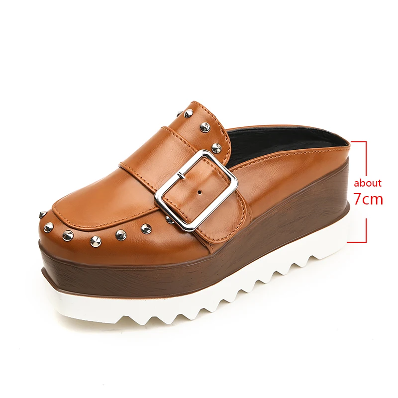 Женские шлепанцы на танкетке, туфли на высокой платформе, коричневые туфли-лодочки с ремешком на пятке, модная повседневная женская обувь на толстой подошве с заклепками и пряжкой