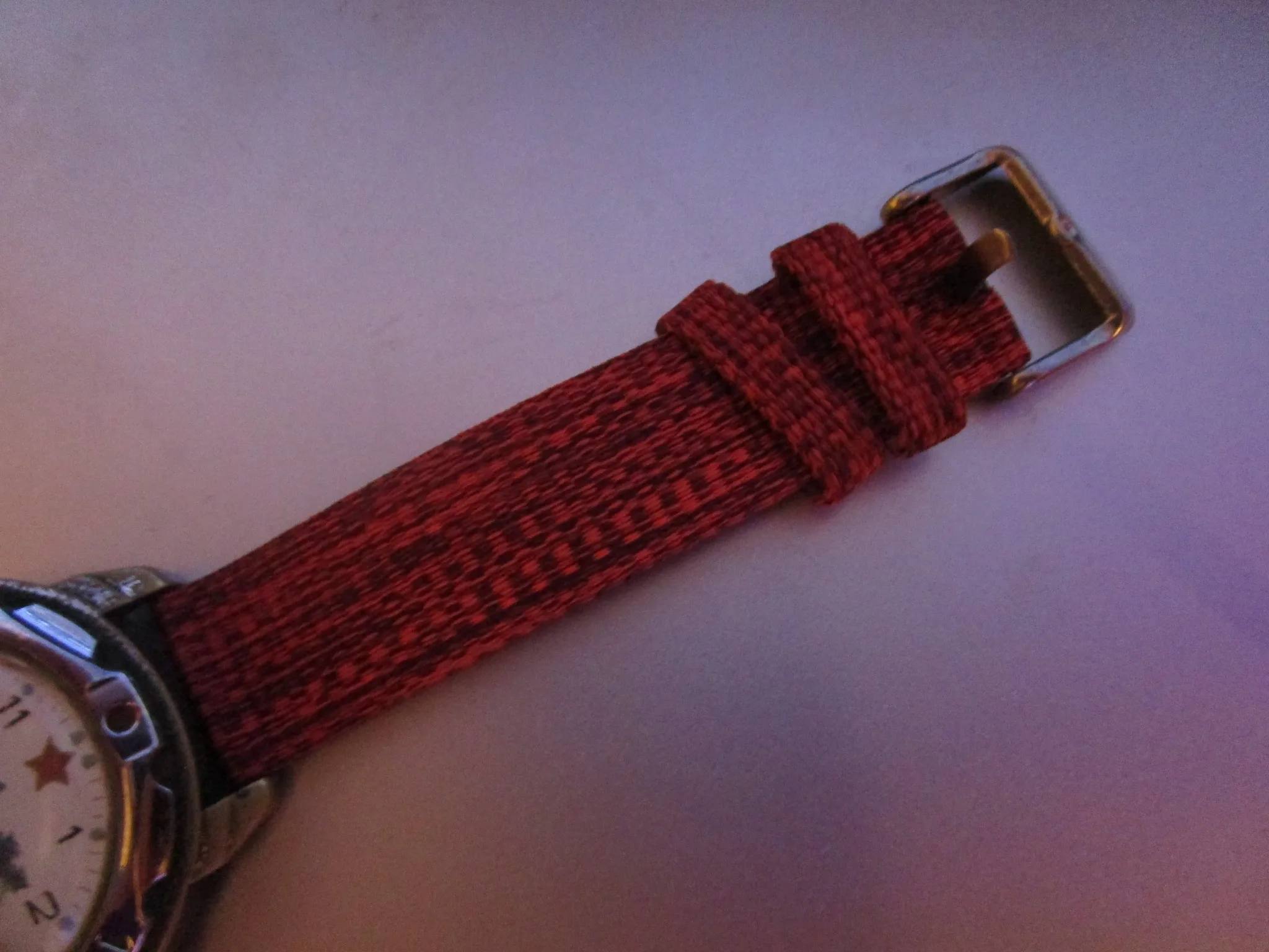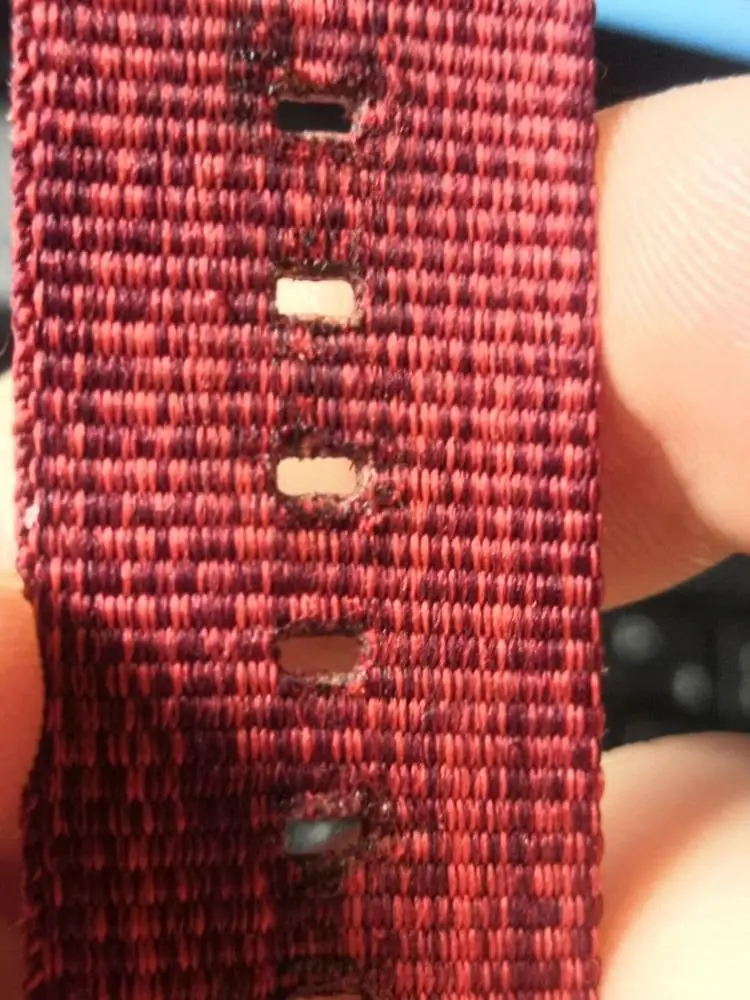 Красный стал моим основным ремешком для третьих стратосов. В кратце - я доволен Отверстия в ремешке проплавлены, и не размохрятся. Изнутри выглядят не очень красиво, но это меня не заботит, показал на втором фото. Края сделаны аккуратно. Сам материал ремешка выглядит сэндвич из двух слоёв очень плотной ситнетической холстины, и тонким слоем то ли пластика то ли клея между ними. На первом фото постарался поймать как выглядит тренчик, он из того же материала. Не тянется как идущий в комплекте силиконовый. Краситель не вымывается, то есть рука не окрашивается - проверял водой и на двух тренировках потел. Сам ремешок чуть-чуть деформировался со временем, но форму не потерял, см третье фото.