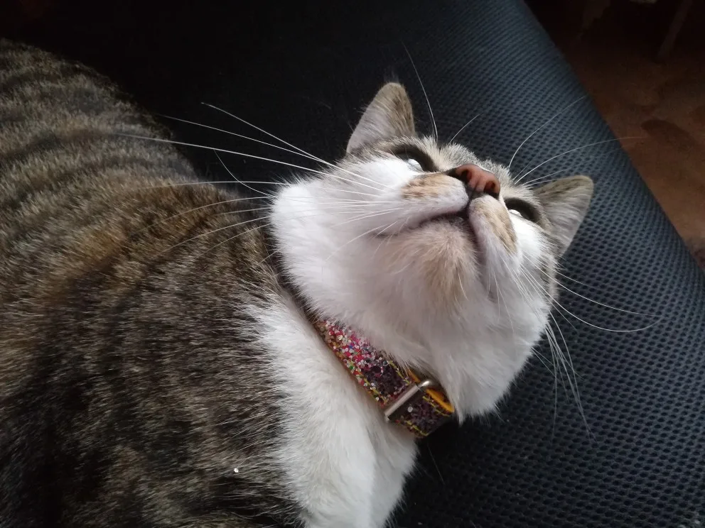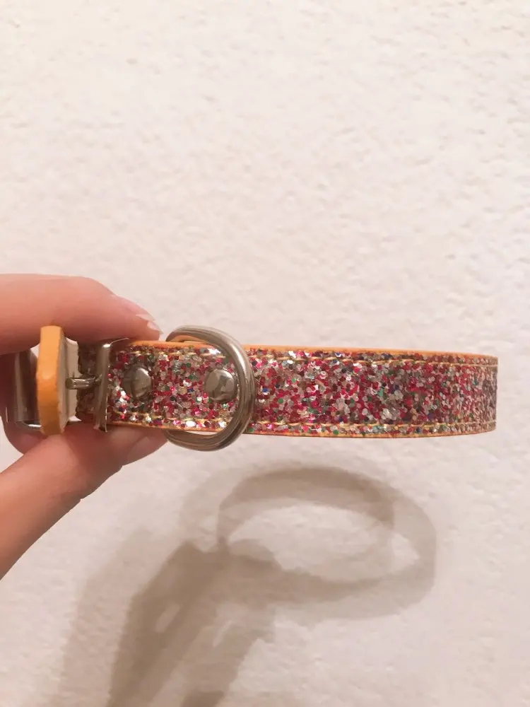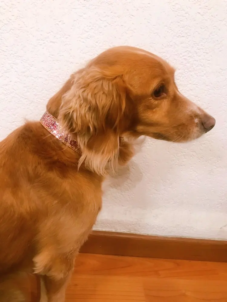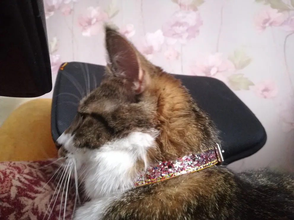 хороший ошейник,материал не тяжёлый. на кошку садится нормально, не болтается, но все же больше подойдёт для собаки, т. к фурнитура довольно тяжелая и массивная. очень красиво переливается, блестки приклеены прочно, но если кошка будет расчесывать шею то наверное будут сыпаться. кошка нарядная :)
