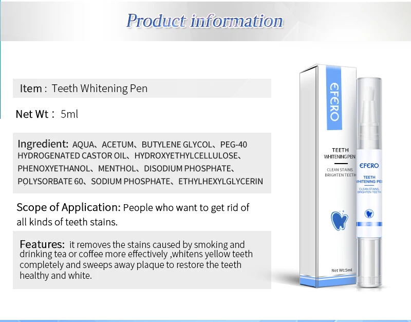 После чистки зубов снимите колпачок и поверните конец отбеливающего пера, пока эссенция не перелойдет на головку кисти. Затем равномерно нанесите изделие на зубы и нанесите краску чистой водой через 15-20 минут, мы рекомендуем использовать 2-3 раза в неделю.